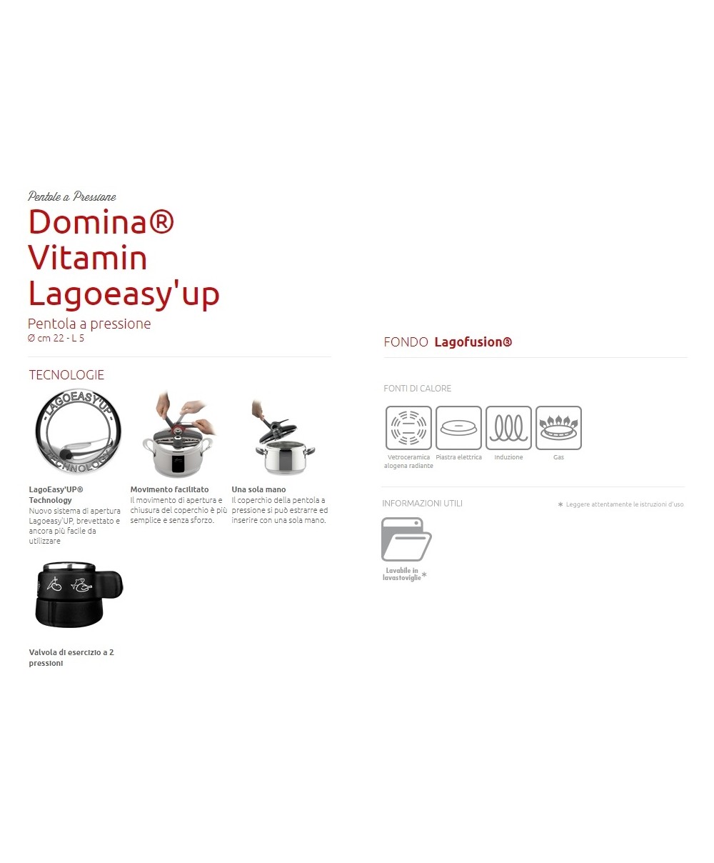 "La Pentola a pressione DOMINA® VITAMIN LAGOEASY'UP rappresenta oggi un’innovazione senza precedenti grazie all’esclusiva LagoEasy’Up® Technology, il nuovo sistema di apertura brevettato, facile da aprire con una sola mano ed in un solo movimento. La pentola a pressione è uno strumento versatile perché consente la cottura a vapore, ad immersione e a rosolatura; è salutare, perché cucinando in pentola a pressione si preservano fino al 35% di vitamine e di sali minerali in più; è veloce, perchè riduce i tempi di cottura fino al 50%. E' inoltre dotata di ben 6 sistemi di sicurezza e della valvola Vitamin a due pressioni: posizione 1 per alimenti delicati come le verdure, posizione 2 per carne e pesce. Il fondo a 3 strati LAGOFUSION® è adatto a tutti i piani di cottura, induzione inclusa, per una perfetta diffusione del calore.