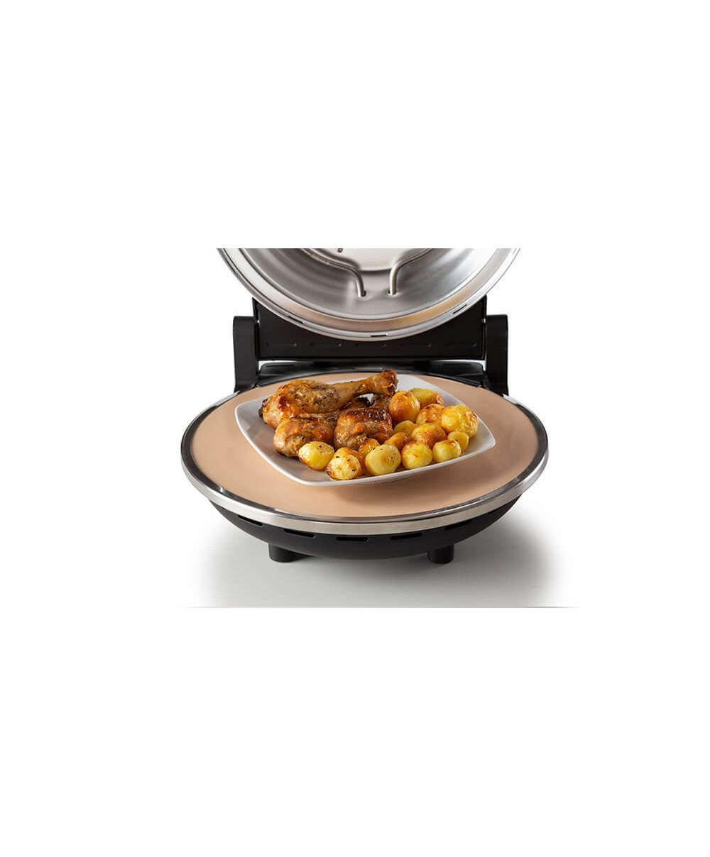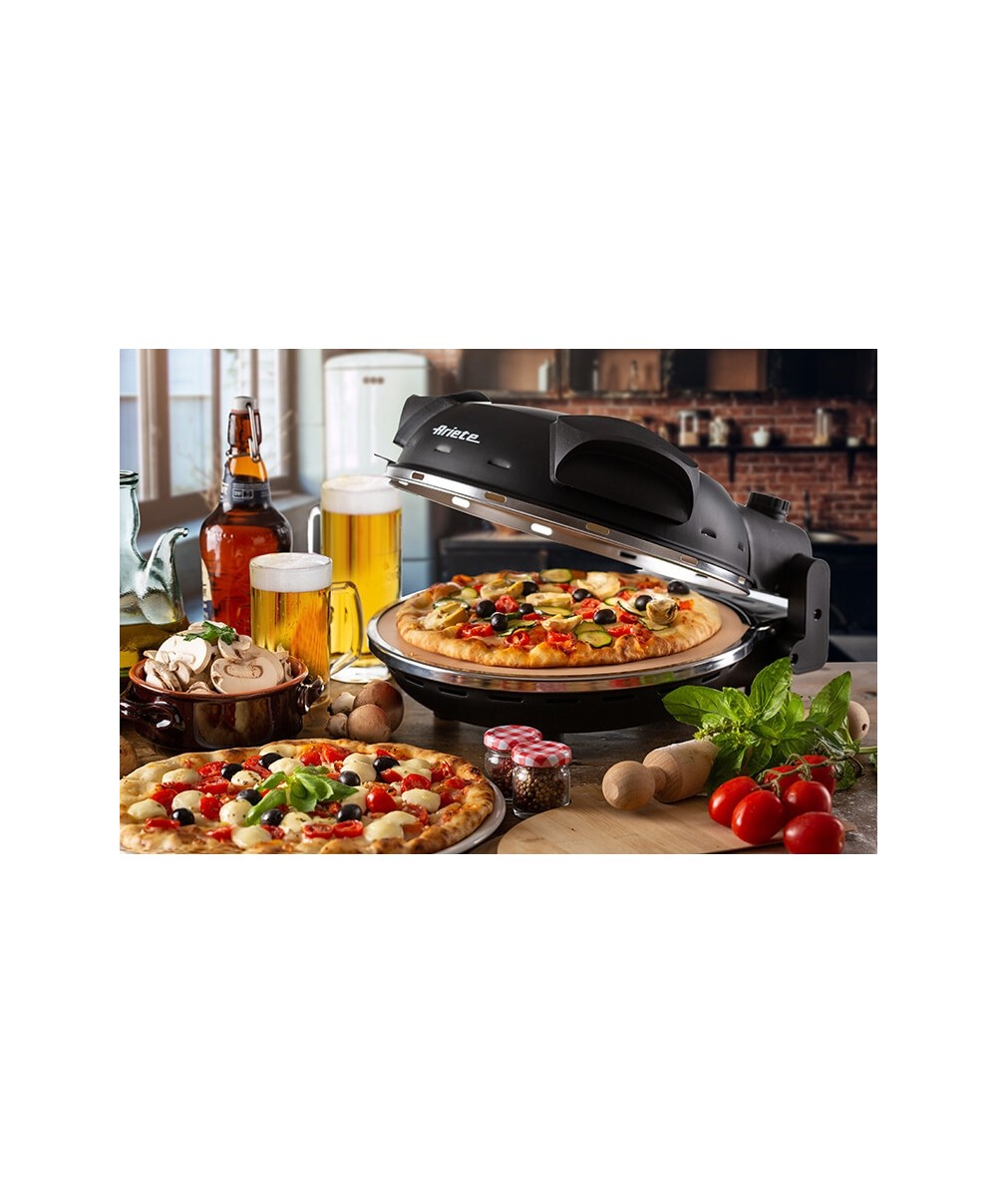 "Il forno pizza di Ariete sarà l’alleato in cucina di tutti gli amanti della pizza. Il prodotto migliora le sue prestazioni con una piastra in pietra refrattaria di alta qualità dal diametro di 32cm che permette di cuocere e/o riscaldare pizza e focacce a cinque livelli di cottura, fino a una temperatura massima di 400 gradi. La pietra refrattaria è dotata di un trattamento trasparente antiaderente che rende la pulizia della pietra migliore in quanto i residui e l'olio non vengono assorbiti dalla pietra stessa.