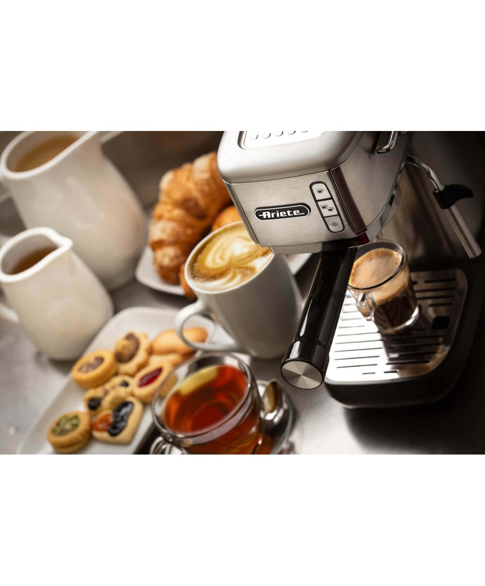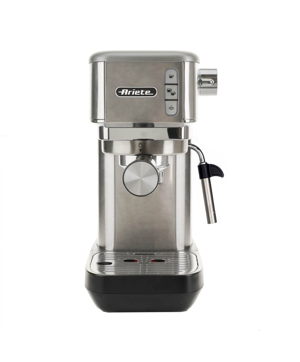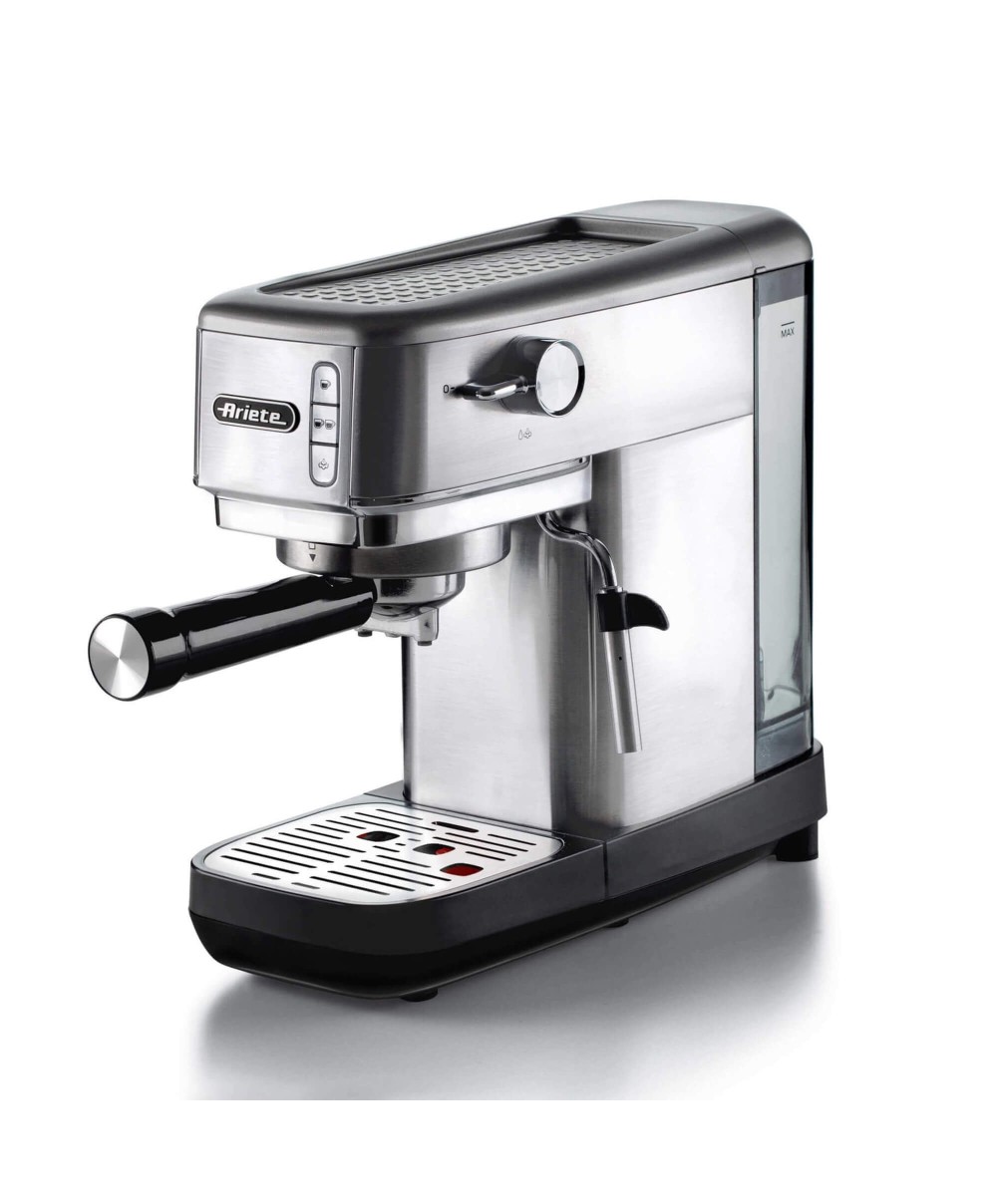 La macchina da caffè 1380 di Ariete è interamente in metallo dal design super slim ideale per caffè gustosi e cappuccini cremosi grazie al dispositivo Maxi-Cappuccino. Compatibile con polvere di caffè e cialde ESE. Erogazione acqua calda per tè e tisane. Silver
