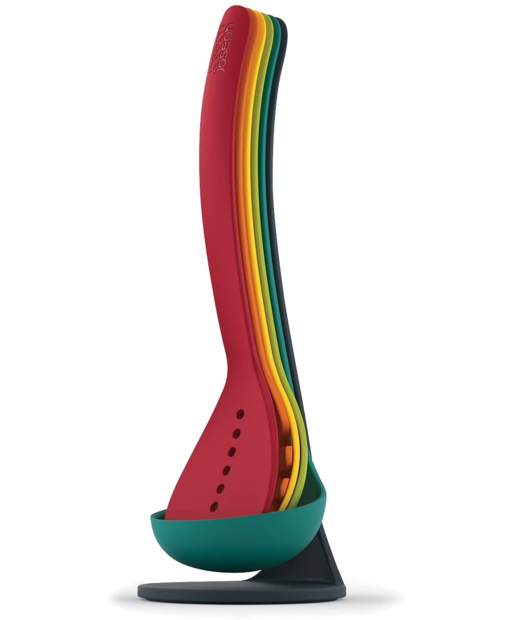 "Il set 10124 di Joseph Joseph include: spatola forata, servispaghetti, mestolo forato, cucchiaione e mestolo.