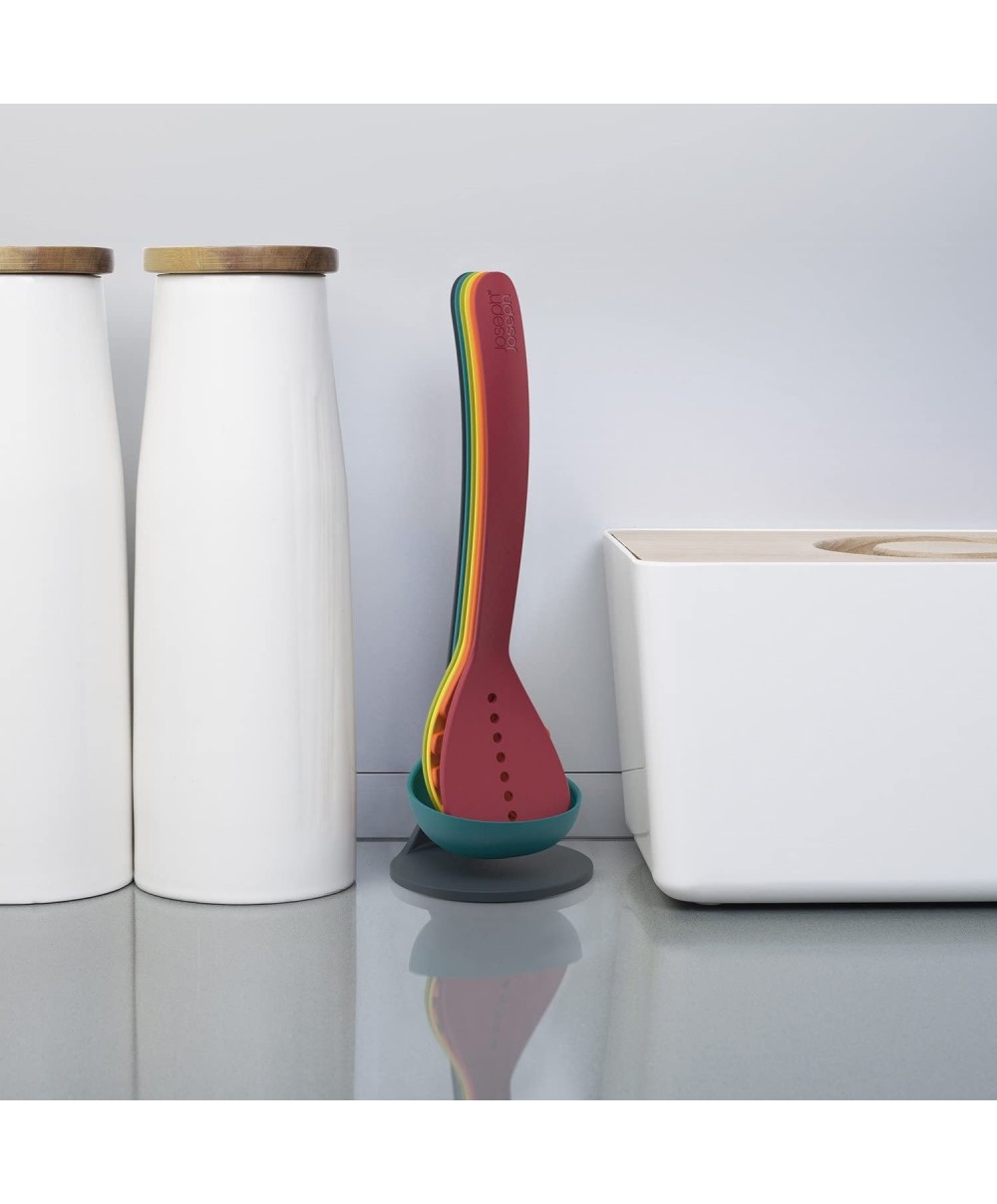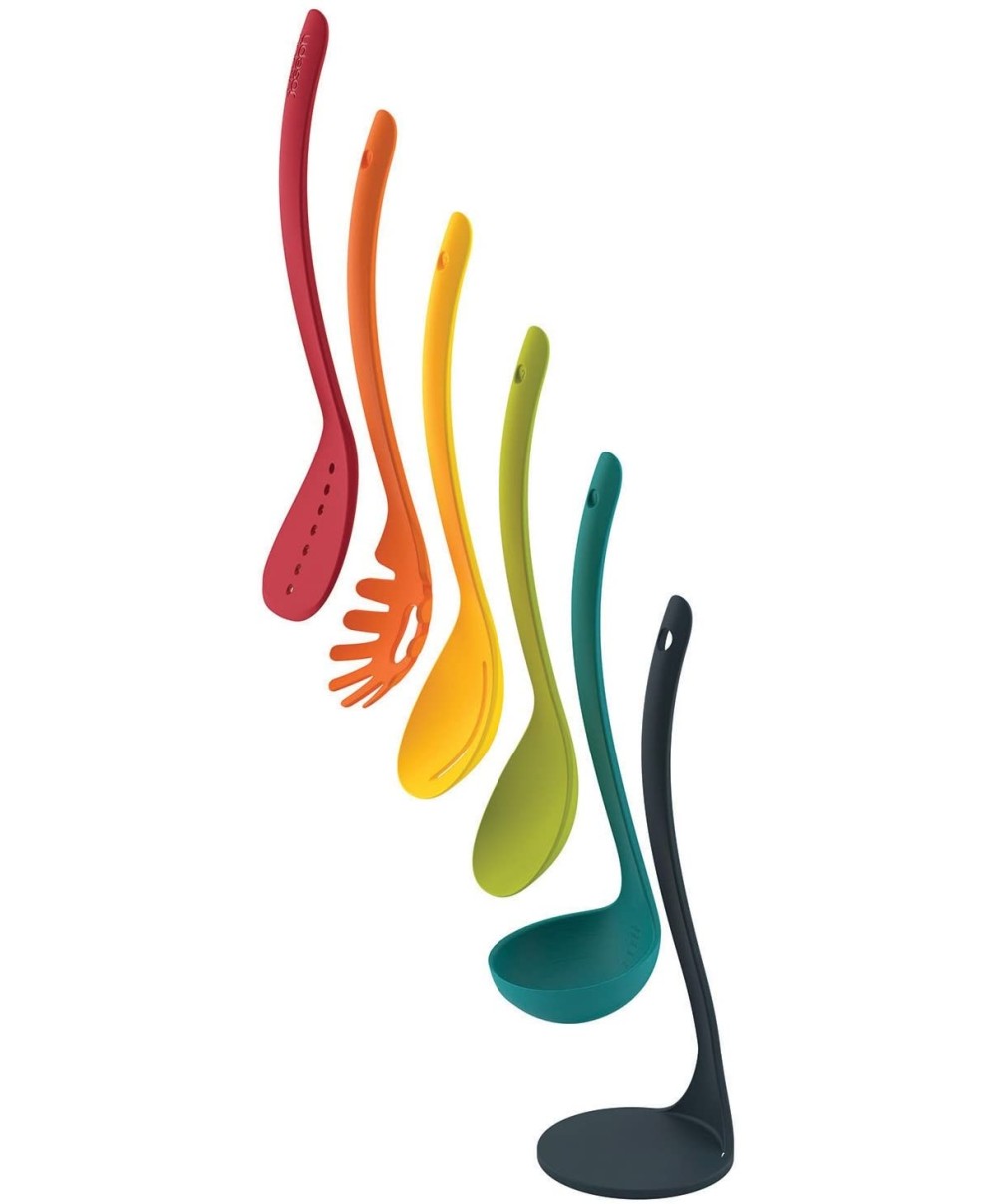 Il set 10124 di Joseph Joseph include: spatola forata, servispaghetti, mestolo forato, cucchiaione e mestolo.