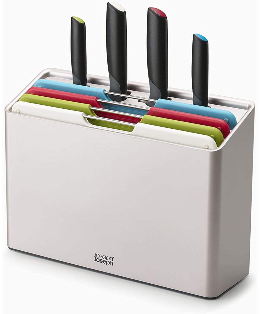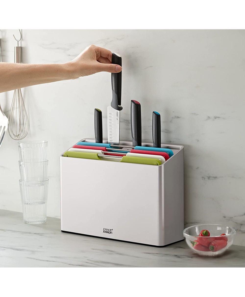 "60198 è il set di Joseph Joseph che ti permetterà di mantenere tutti i tuoi utensili da taglio ben organizzati. È composto da 4 taglieri, con colori differenti, organizzati in schede e da quattro coltelli Elevate™ corrispondenti.