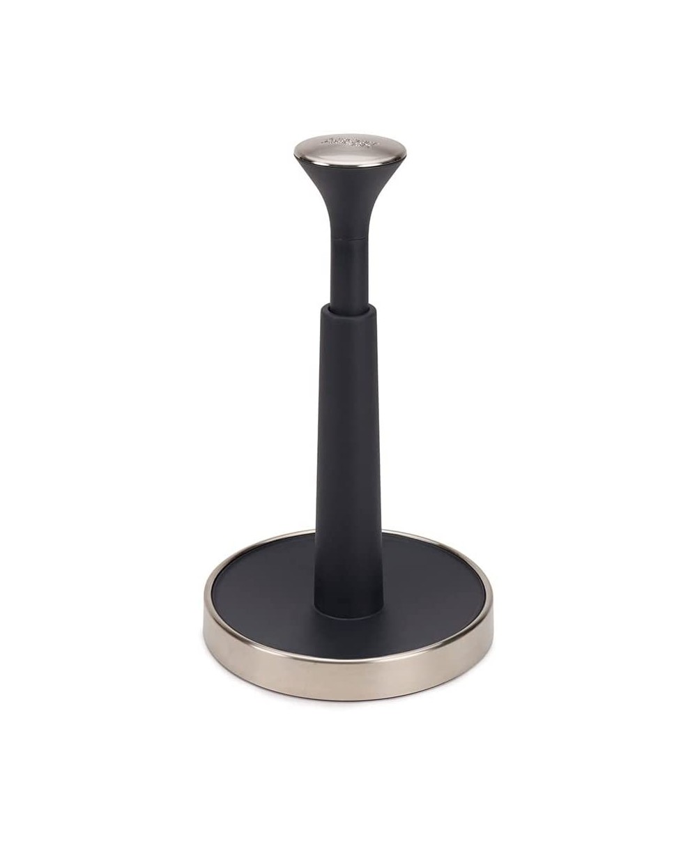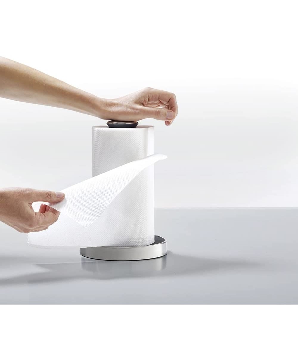85140 è il portarotolo intelligente di Joseph Joseph è dotato di un tappo superiore a molla che può essere abbassato per bloccare il rotolo e strapparlo facilmente.