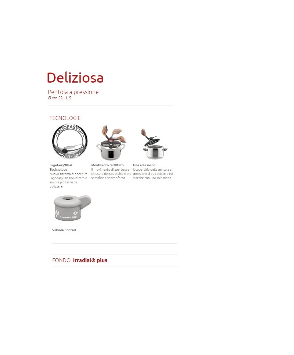 "La Pentola a pressione Deliziosa Lagoeasy’Up rappresenta oggi un’innovazione senza precedenti grazie all’esclusiva LagoEasy’Up® Technology, il nuovo sistema di apertura brevettato, facile da aprire con una sola mano ed in un solo movimento. La pentola a pressione è uno strumento versatile perché consente la cottura a vapore, ad immersione e a rosolatura; è salutare, perché cucinando in pentola a pressione si preservano fino al 35% di vitamine e di sali minerali in più; è veloce, perchè riduce i tempi di cottura fino al 50%. E' inoltre dotata di ben 6 sistemi di sicurezza e della valvola Control: basta ruotarla accompagnando la levetta per controllare direttamente la fuoriuscita verticale del vapore Il fondo a 3 strati IRRADIAL® PLUS è adatto a tutti i piani di cottura, induzione inclusa, per una perfetta diffusione del calore.