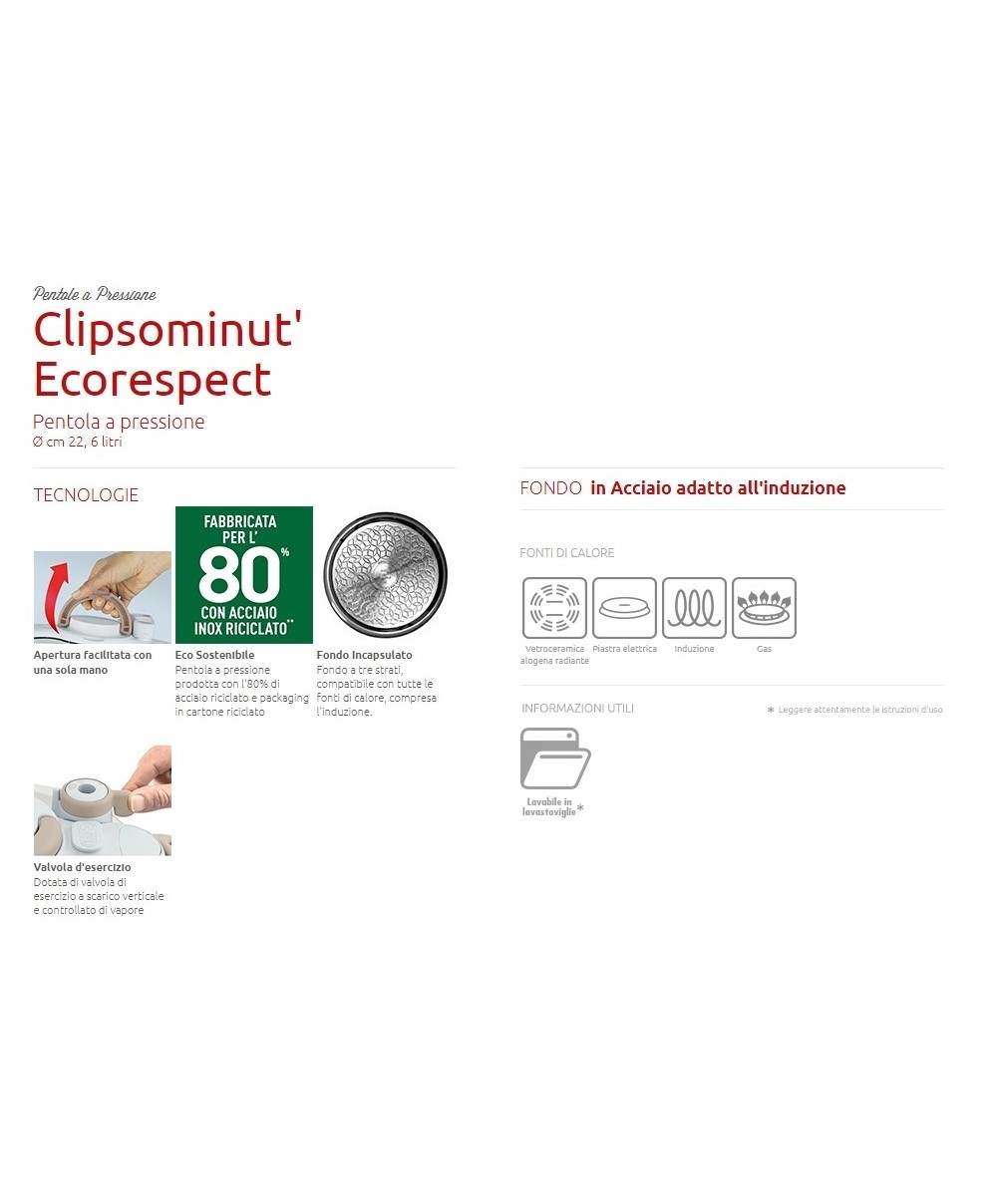 ClipsoMinut' Eco Respect è la prima pentola a pressione Lagostina pensata per essere eco-sostenibile. Il corpo in acciaio inox 18/10 è prodotto utilizzando l'80% di acciaio riciclato, e anche la scatola è composta da cartone riciclato.