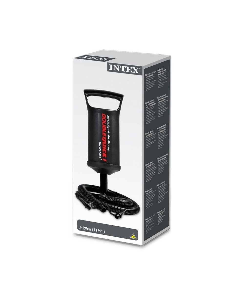 68612 è la pompa manuale piccola di Intex con tubo per gonfiaggio e sgonfiaggio e 3 adattatori. Gonfia sia spingendo che tirando.