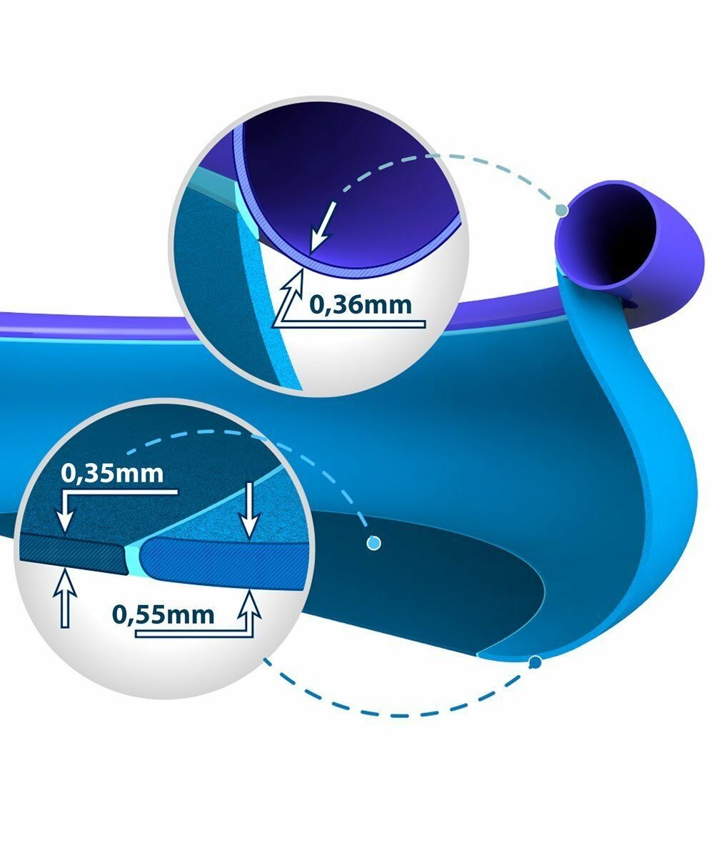 Il fondo e le pareti sono realizzati in triplice strato: uno strato interno ed esterno in Pvc spesso e resistente ed uno intermedio in poliestere.