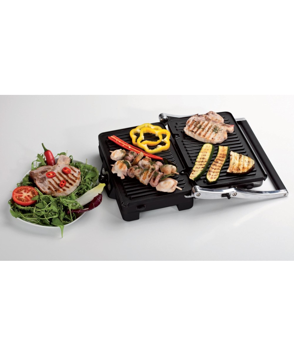 Griglia a contatto con finiture in acciaio inox. Piastre rigate con doppia posizione di cottura e temperatura regolabile.