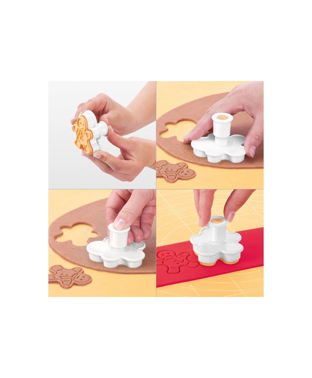 L’idea più originale per Natale? Preparare biscotti a forma di omini di pan di zenzero. Con i timbri ritagli le sagome e allo stesso tempo le rifinisci, imprimendo il decoro nell’impasto. Nessuna fatica grazie all’estrattore che non fa attaccare la frolla o il pan di zenzero al timbro!