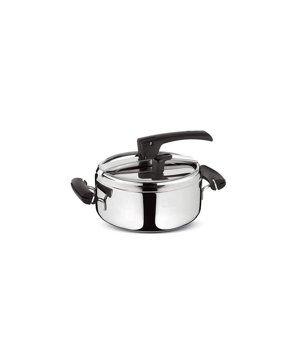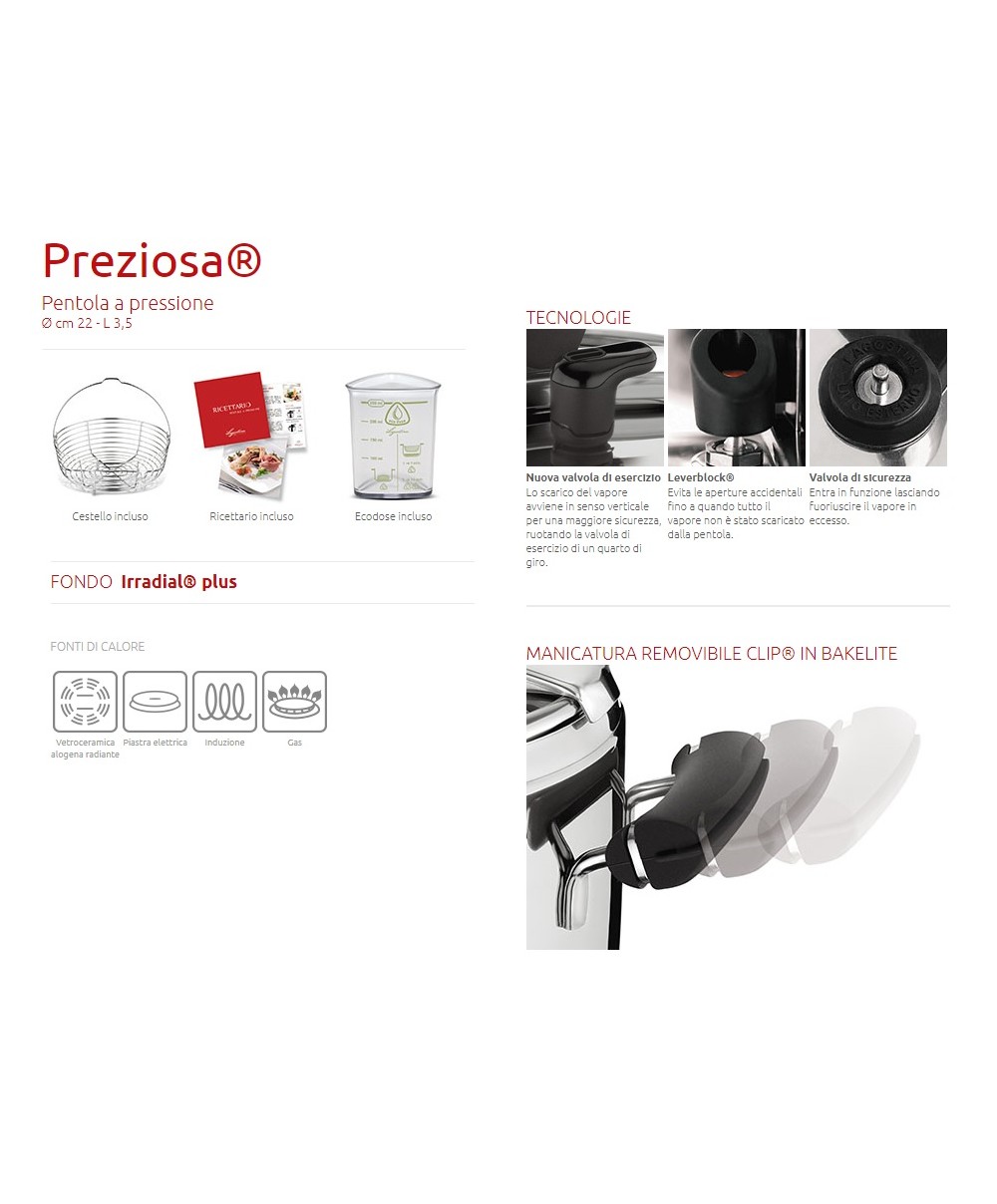 Preziosa è la pentola a pressione di Lagostina che offre la praticità e la naturalità della cottura in pressione. La forma particolare della leva, ed il manico che copre la forcella del meccanismo di apertura, la rendono particolarmente ergonomica ed esteticamente gradevole, anche grazie agli eleganti inserti in bakelite nera. La sicurezza è massima grazie al dispositivo LEVERBLOCK® che blocca la maniglia d'apertura anche con una minima pressione residua all'interno, evitando aperture accidentali, alla valvola d’esercizio a scarico verticale del vapore e alla nuova valvola di sicurezza in silicone.