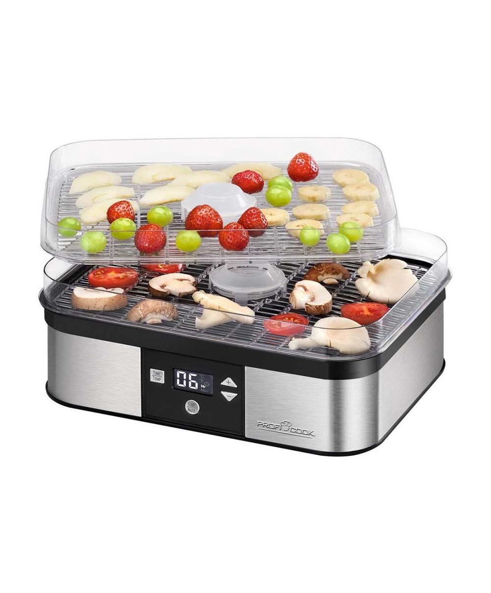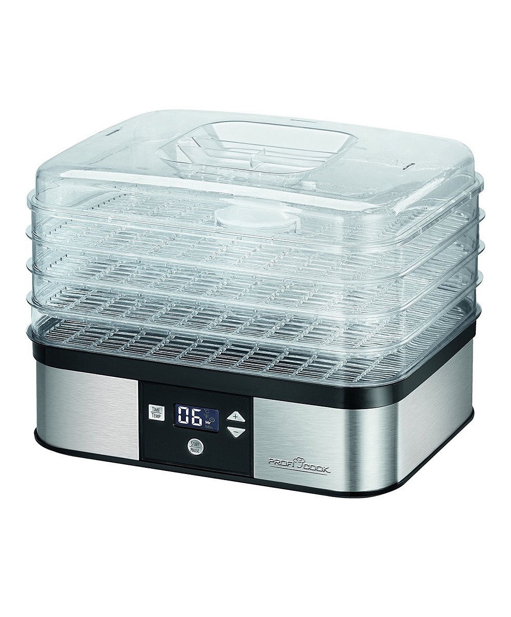 DR1116 è l'essiccatore di Proficook che, grazie all'impostazione della temperatura regolabile elettronicamente fra i 40 e i 70°C, permette di scegliere la corretta temperatura per ciascun tipo di cibo. I 4 vassoi trasparenti possono essere combinati in vari modi.
