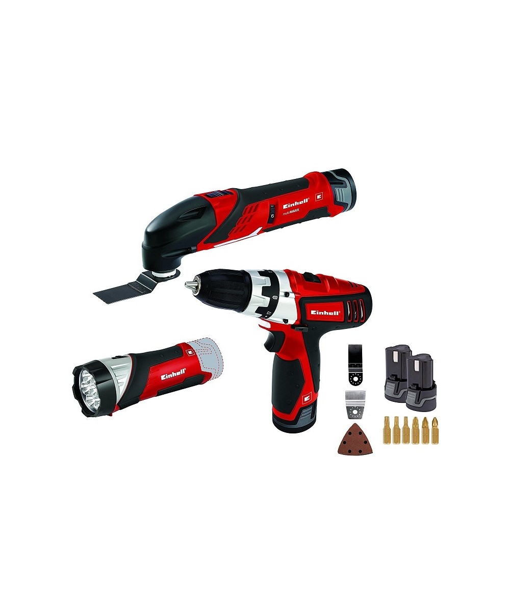 "Il Set utensili 4257191 di Einhell è l'ideale per gli amanti del "fai da te" infatti, comprende un trapano avvitatore, un utensile multifunzione, una torcia, due batterie da 12 V 1,3 Ah, un caricabatteria e alcuni accessori per l’esecuzione di lavori particolari (lama, raschietto, bits, carta abrasiva e platorello). Tutti gli apparecchi sono forniti di impugnatura antiscivolo ed ergonomica per maggior maneggevolezza.