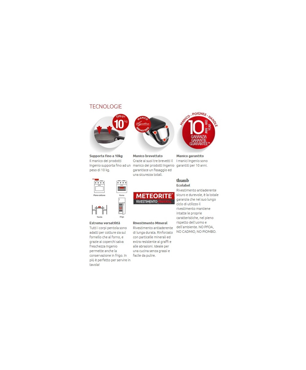 pentola, dotato di ben 3 brevetti e resistente fino a 10Kg. Ingenio è adatto per preparazioni dal piano cottura, al forno, al frigo, è ideale per servire il cibo direttamente