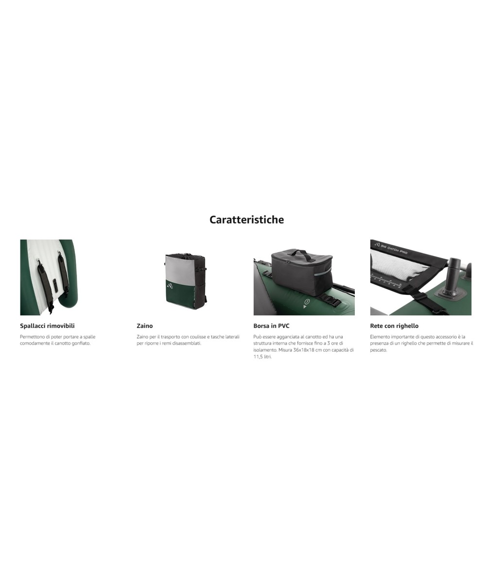 La confezione include una coppia di remi in alluminio da 137 cm; uno zaino per il trasporto con coulisse e tasche laterali per riporre i remi disassemblati; due spallacci da applicare sul canotto gonfiato tramite anelli a D, per trasportarlo comodamente; una pompa manuale.