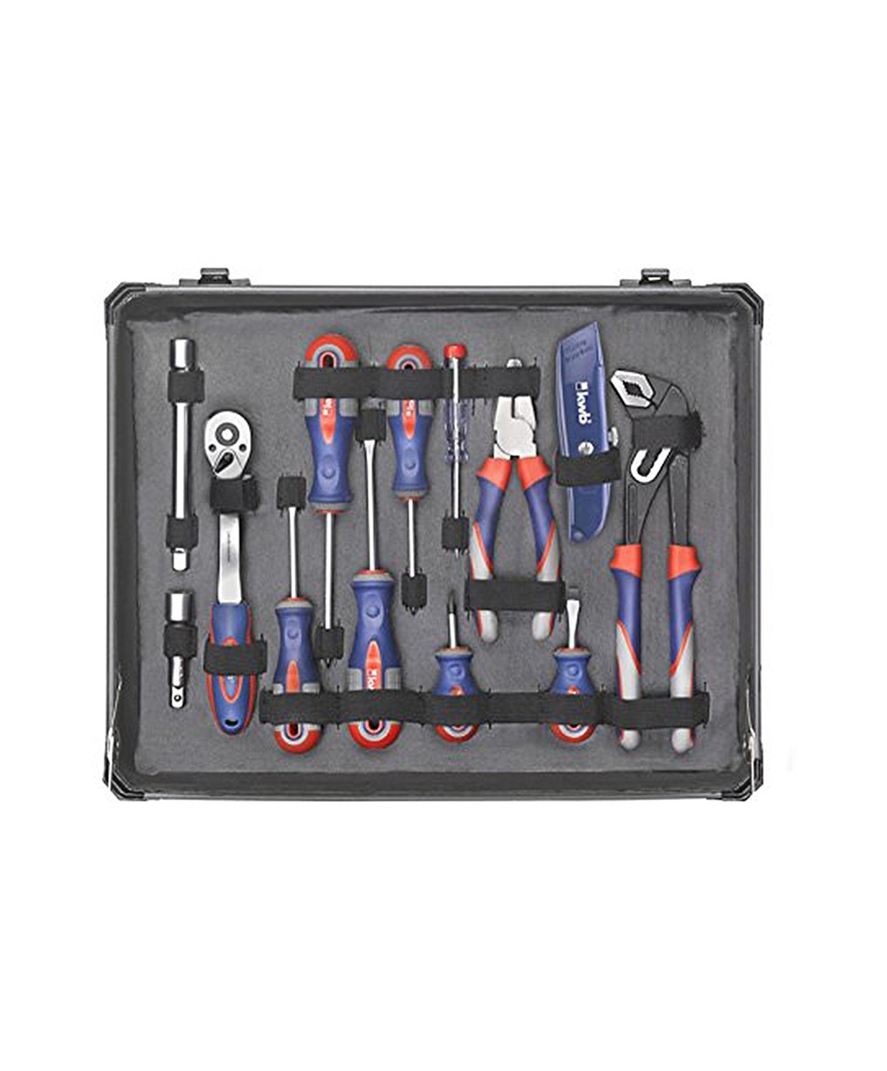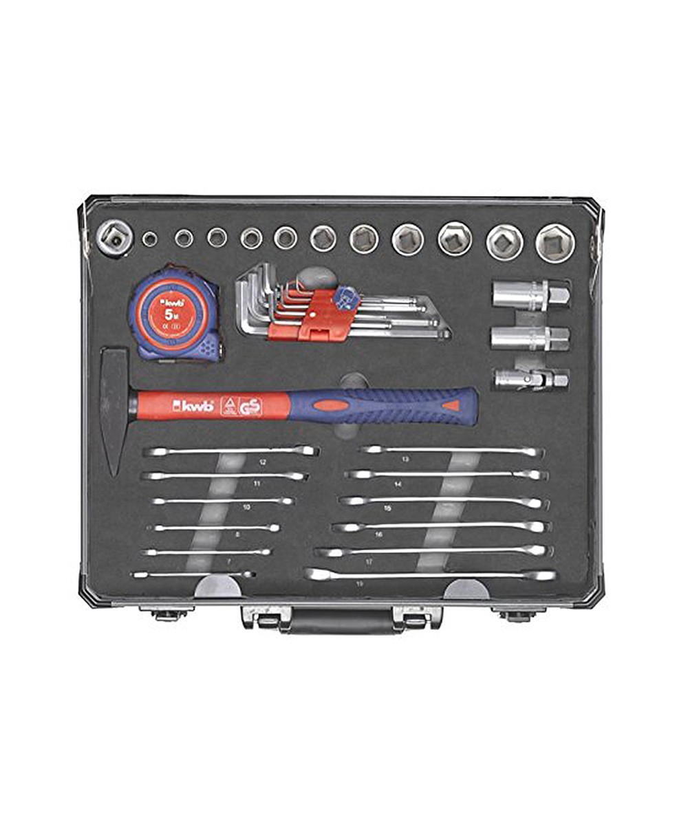 La valigetta di KWB 370740 contiene 51 utensili indispensabili che incontrano le esigenze di numerosi clienti. Dal semplice metro al set di cacciaviti passando poi, alle chiavi combinate, al martello, alle chiavi a brugola e a tanti altri attrezzi.