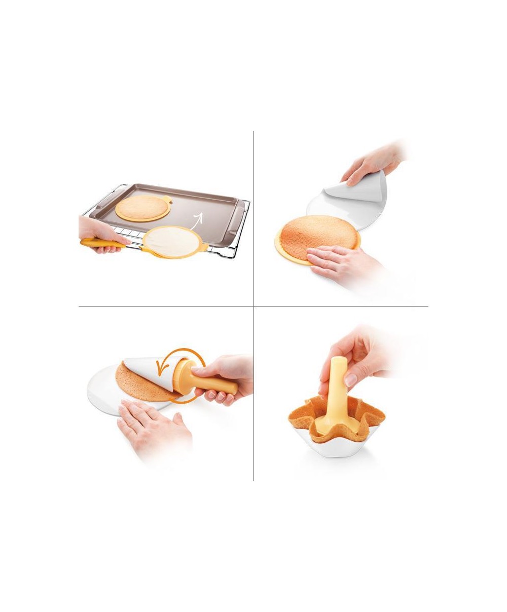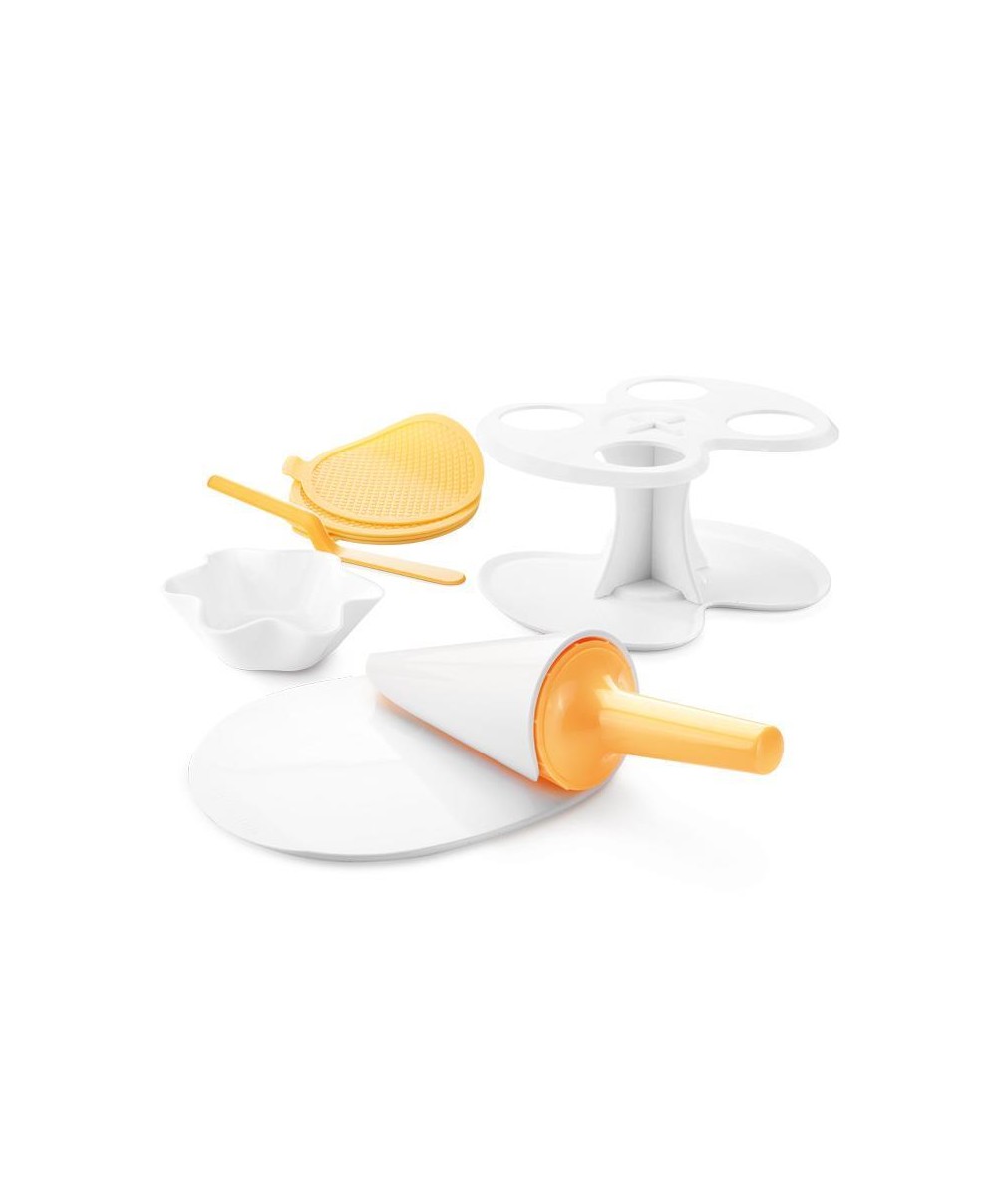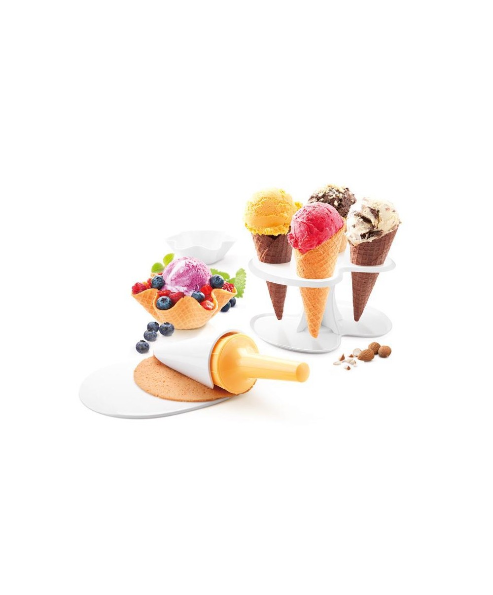 Se prepari il gelato a casa tua, perché non preparare anche i coni e le coppette di cialda? Buonissimi e croccanti, la ricetta per prepararli è semplicissima e a dare la sagoma ti aiuta questo utensile. Cuoci le cialde negli stampi in silicone e poi utilizzi il tampone per formare le coppette, oppure il fuso per i coni. Nella confezione è incluso il ricettario che spiega come preparare cialde classiche, al cacao e anche in versione senza glutine. Il set comprende 4 stampi in silicone per cialde, una spatola, un forma cono e un fuso per coni, un forma coppette con pressa e impugnatura ed un supporto per i coni già preparati.