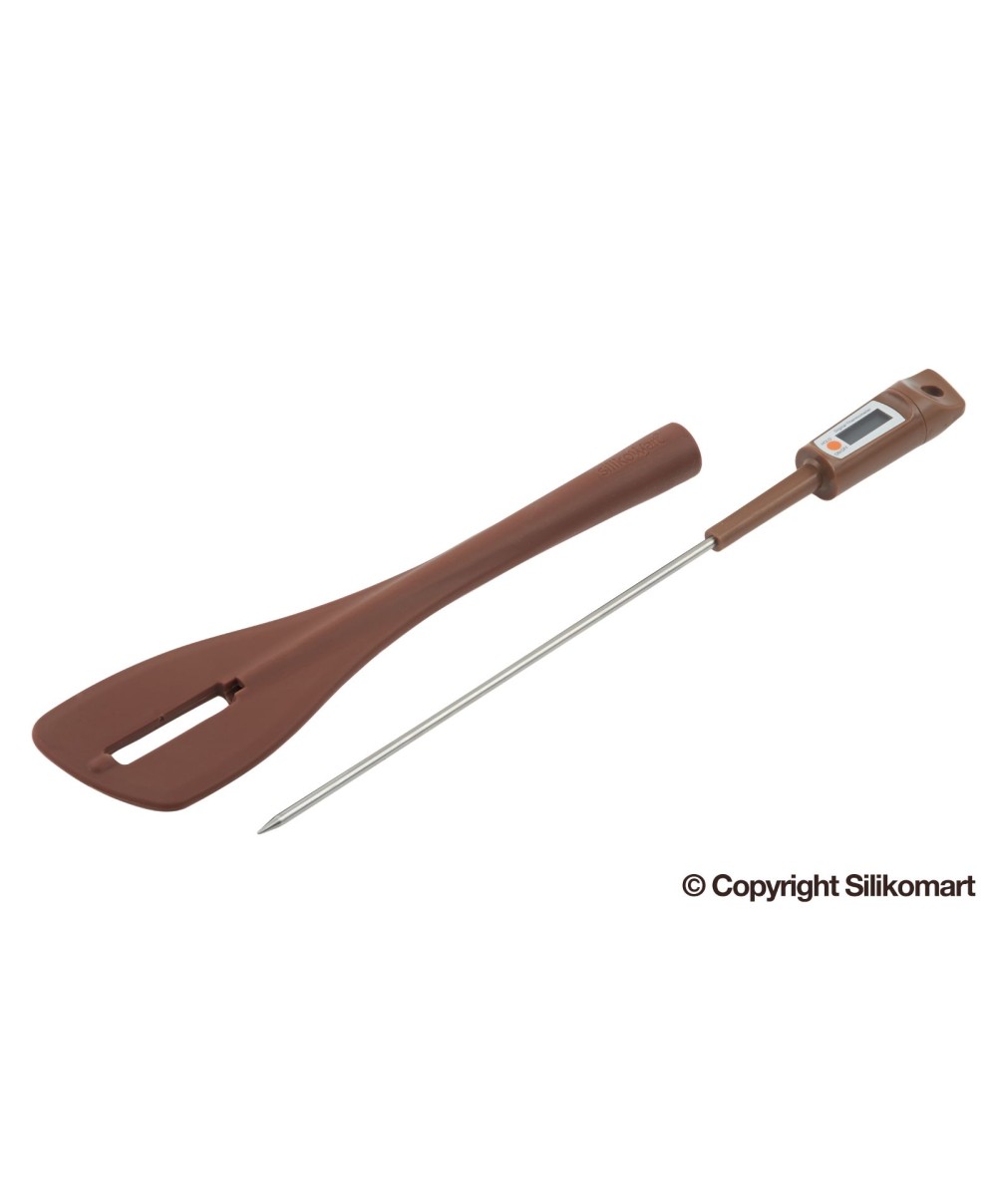 Thermo Choc e' la spatola in silicone con termometro per il controllo della temperatura (da -40°C a 300° C) di cioccolato fuso, creme, salse, marmellate, sciroppi, meringa all'italiana, ecc.