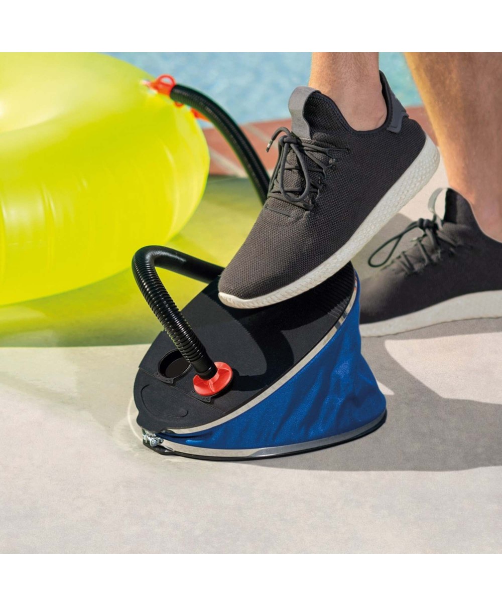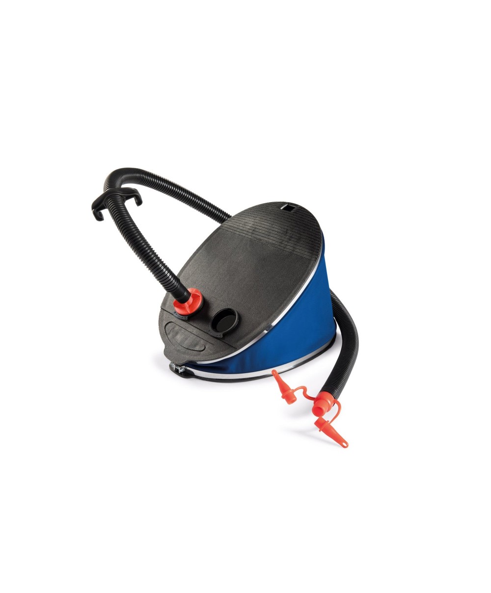 "Gonfia e sgonfia con rapidità usando il soffietto della pompa a piede, di dimensioni 30 cm. I tre ugelli sono adattabili alle valvole dei differenti prodotti gonfiabili.