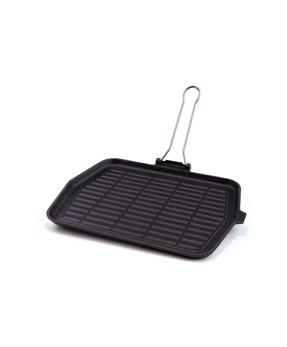 Bistecchiera in ghisa, manico antiscivolo pieghevole, fondo sagomato per una cottura ottimale senza grassi aggiunti. Adatta a piano a induzione.