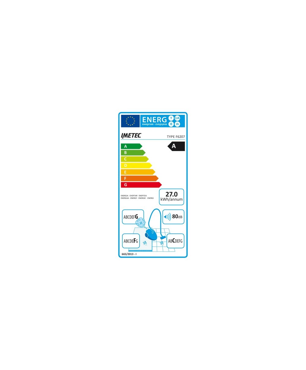 La scopa elettrica IMETEC PIUMA ha ottenuto la classe energetica A, posizionandosi al massimo livello previsto dalle nuove leggi europee sull'etichettatura energetica. Con la classe A IMETEC PIUMA ti offre una maggiore efficienza e consumi annui ridottissimi (come puoi vedere leggendo l'etichetta energetica) a tutto vantaggio della bolletta e dell'ambiente.