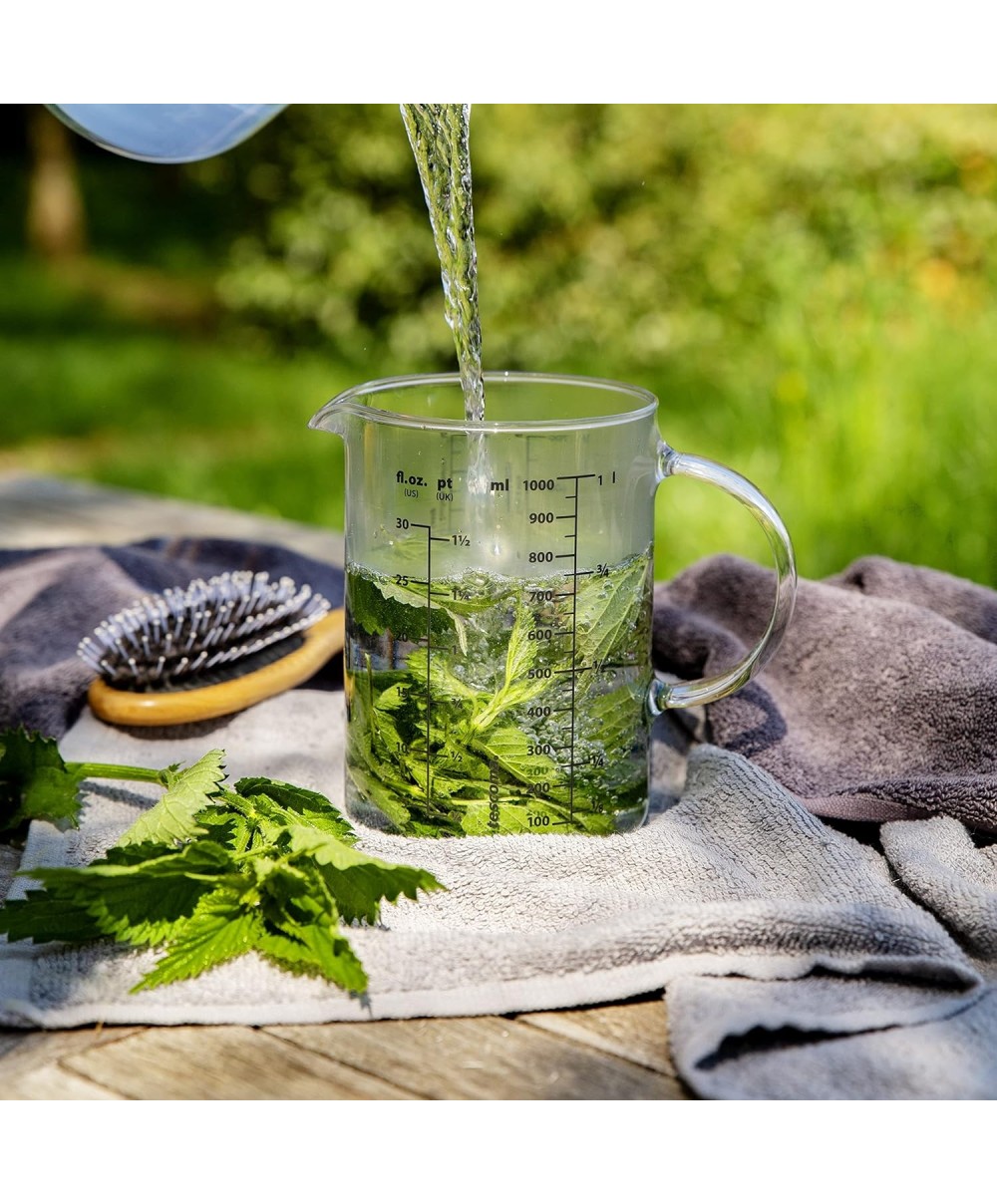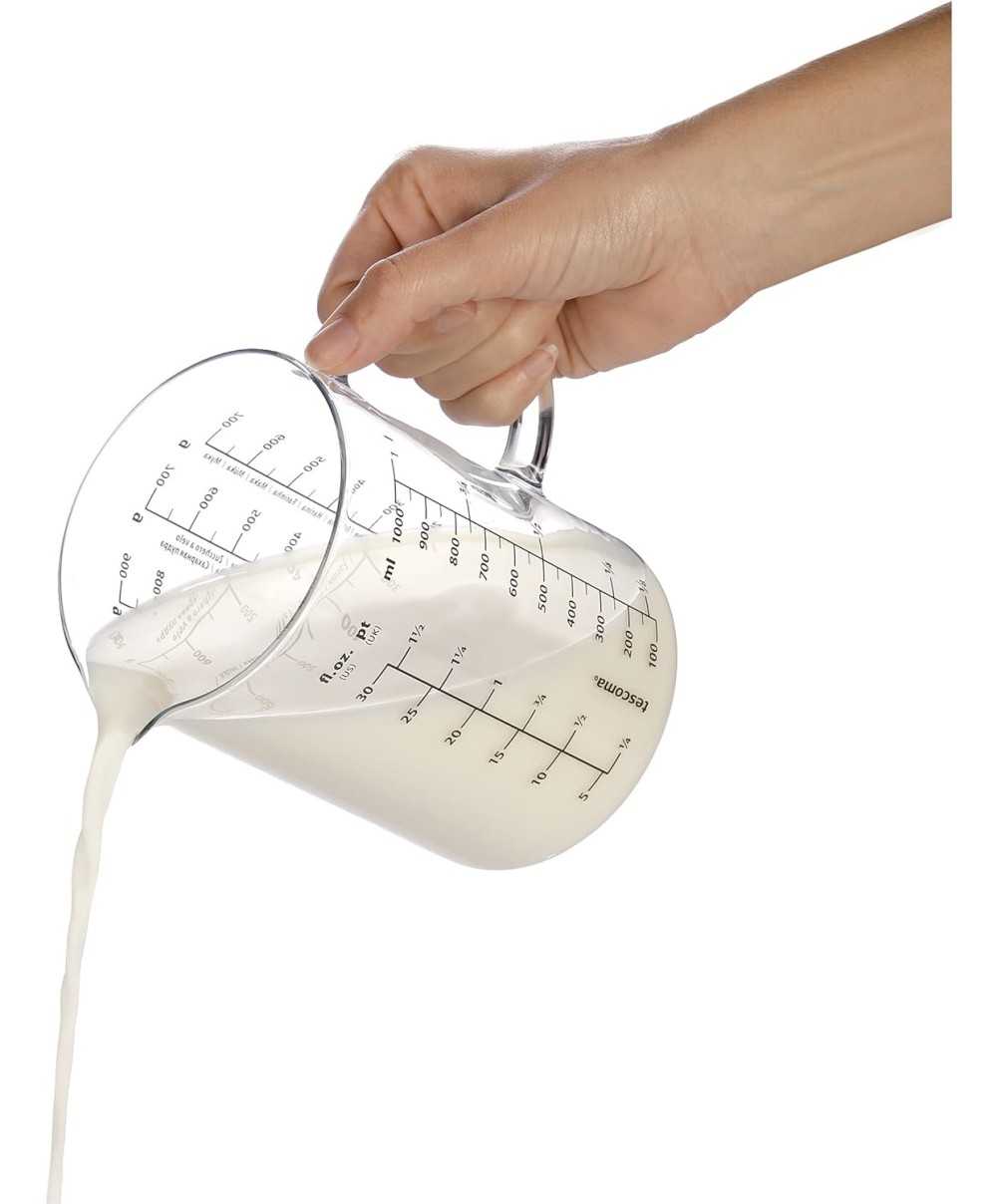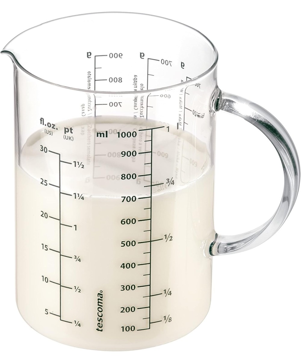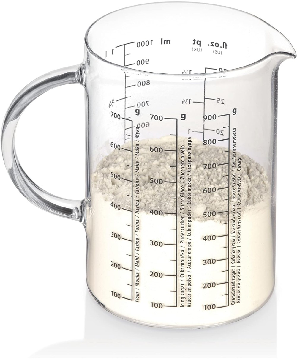 Brocca graduata comoda e resistente perché prodotta in vetro borosilicato, materiale speciale che vanta una grande resistenza al calore, tanto da consentirne l'uso in forno a microonde oltre che su piastre elettriche e sui fuochi a gas impiegando un comune spargi fiamma. Dotata di scala misuratrice sia in grammi che in litri.