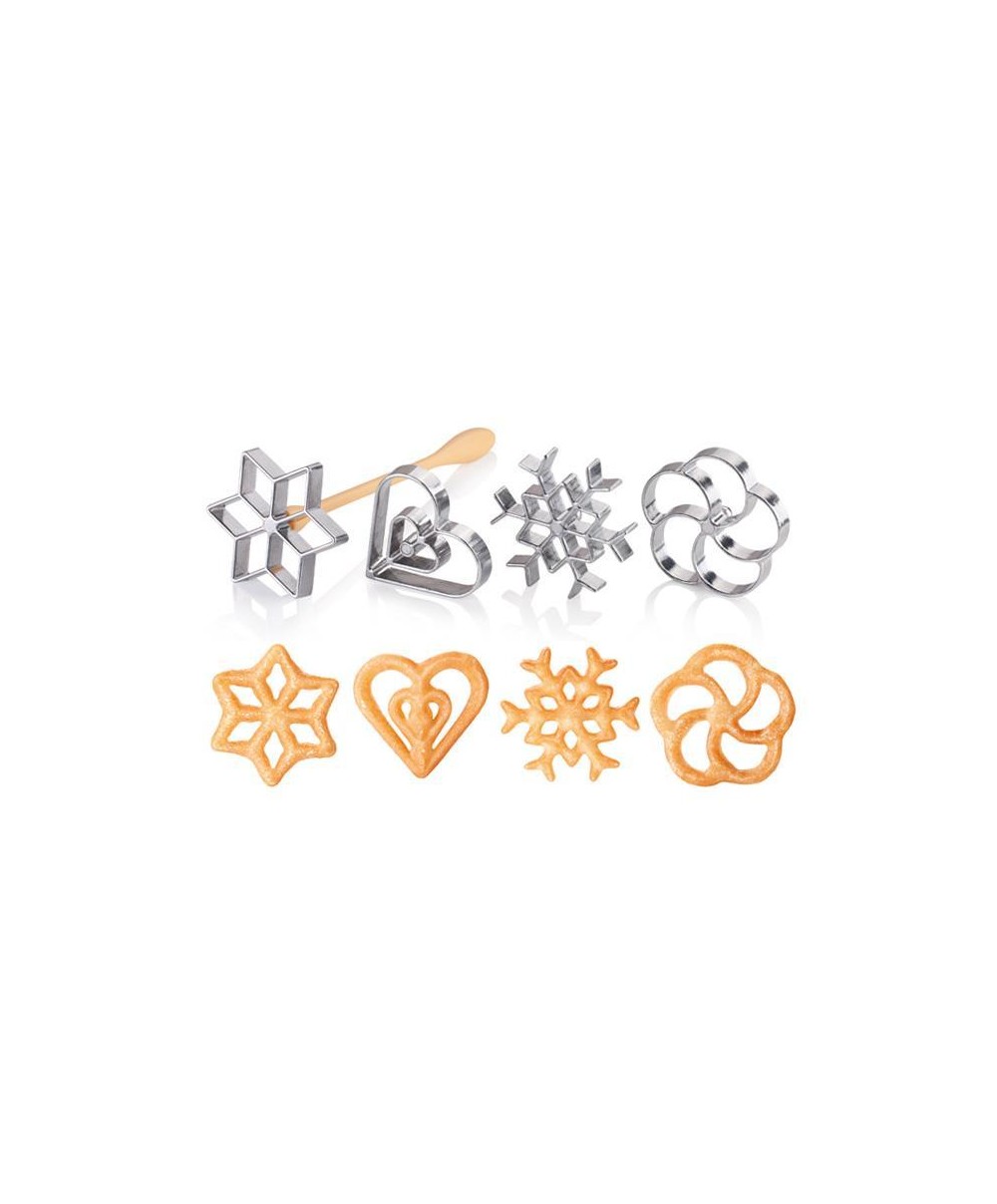 Frittelle tutto l'anno non solo a Carnevale! Il set contiene 4 stampi in metallo a forma di fiocco di neve stella cuore fiore ed un manico removibile in nylon resistente al calore fino a 210 °C.