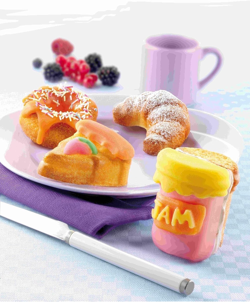 Good Morning ti offre 8 appetitose forme, dal croissant al vasetto di marmellata, dalla ciambellina alla fetta di torta.Dimensioni dello stampo: 29,5 x 17,5 cm ca