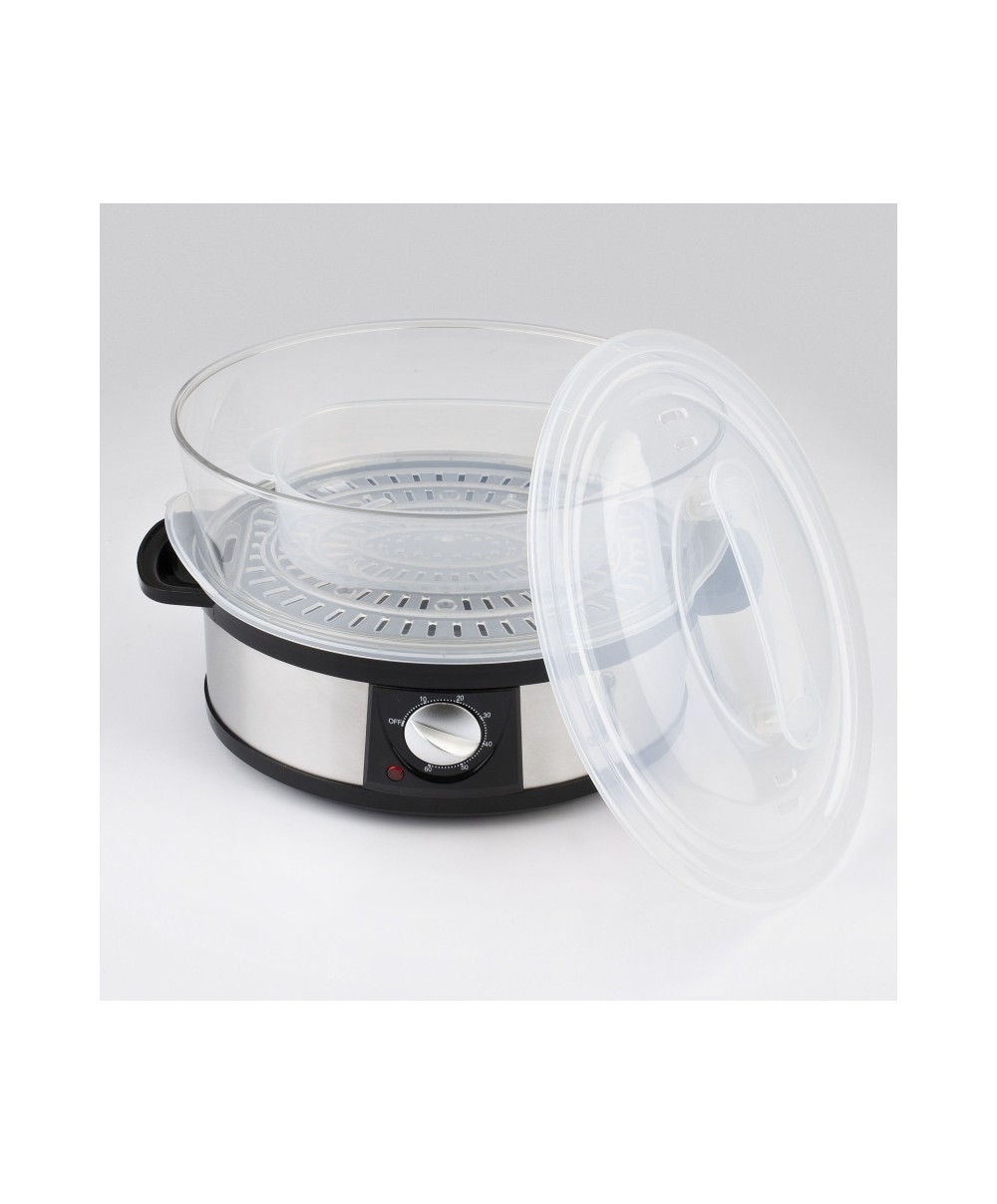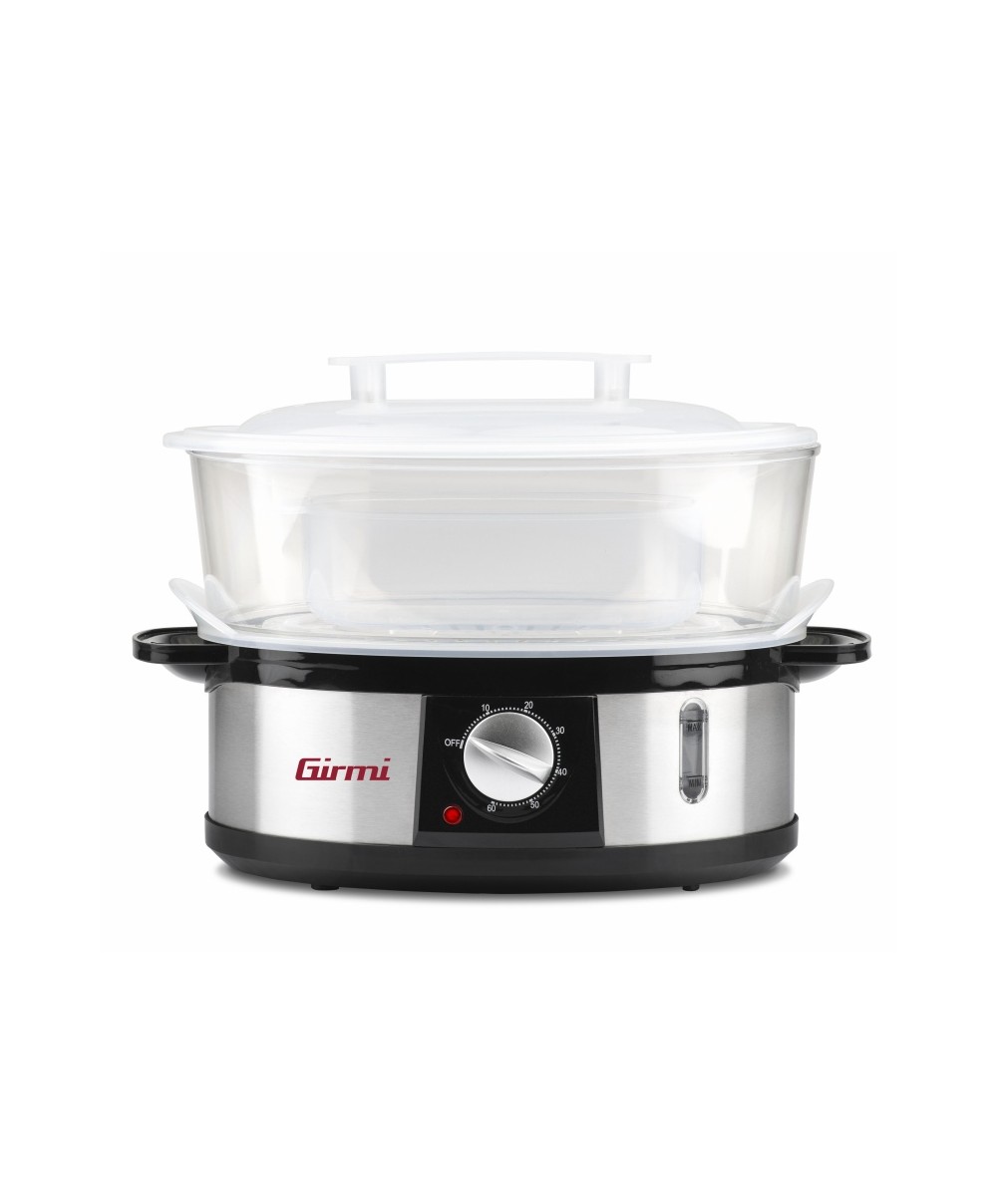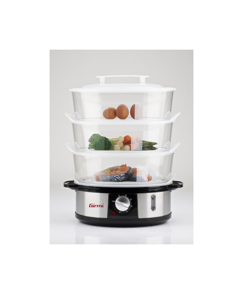 "La cottura a vapore è sana, naturale e dietetica e consente di mantiene intatti i sali minerali e le vitamine contenuti nei cibi. Con la vaporiera a tre livelli Girmi VP26 è possibile cuocere una grande varietà di alimenti, anche contemporaneamente, come cereali, ortaggi, frutta, uova, pesce, carne e pollame senza aggiunta di oli e grassi. Il set comprende tre vassoi trasparenti da 4 litri e una ciotola per il riso da 1 litro e dispone di funzione timer da 60 minuti con auto-spegnimento di sicurezza in caso di esaurimento dell’acqua, possibilità di rabbocco continuo e coperchio antigocciolamento per la massima praticità d’uso. Realizzata con corpo in acciaio inox, la vaporiera VP26 è molto veloce da smontare per una facile pulizia.