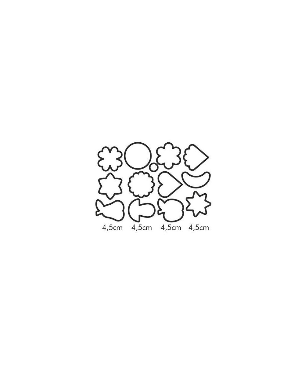 - Ideali per preparare biscotti con forme tradizionali: cuore, fiore, tondo, mela pera, fungo, ventaglio, quadrifoglio, stella, luna ecc.