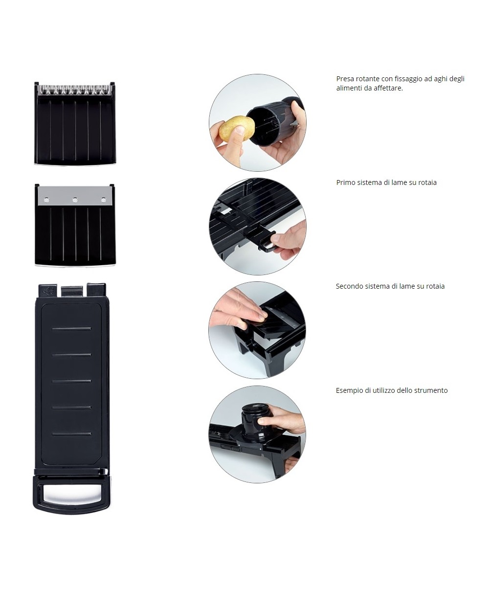 - 6 accessori per permettere ogni tipo di lavorazione (Julienne, Rondelle ondulate, Fette, Cialde, Cubi/rombi, Julienne ondulato)