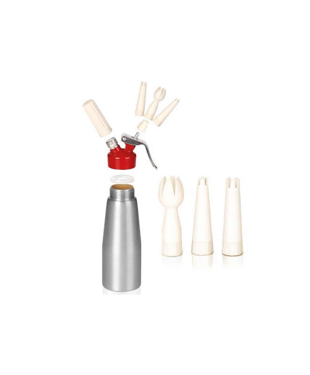 Se ami la cucina, la pasticceria e sei sempre alla ricerca di nuove tecniche, nuovi sapori e nuove sensazioni, questo è lo strumento adatto a te. Con il sifone realizzi spume dalla consistenza incredibile. Puoi ottenere una deliziosa panna montata o mousse dolci o salate utilizzando i più svariati ingredienti. È prodotto in alluminio alimentare e fornito con tre beccucci decoratori in plastica per creare delle delizie da gourmet. Funziona con comuni capsule di ossido nitroso, non incluse nella confezione.