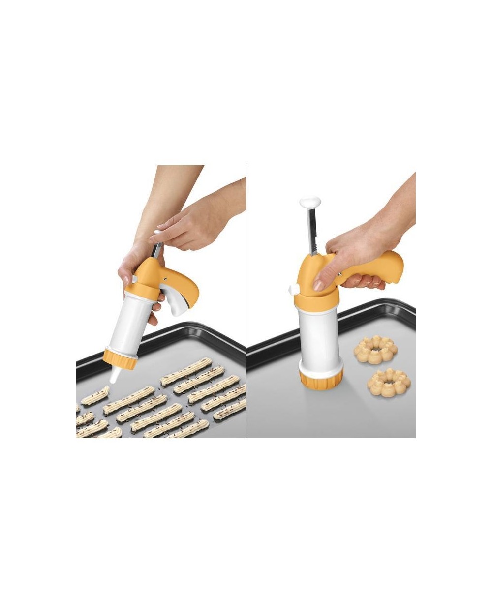 Vuoi realizzare biscotti come quelli comprati in pasticceria? Ti serve una pistola sparabiscotti! La riempi con l’impasto che desideri e lo spari direttamente sulla teglia antiaderente senza imburrarla e senza usare carta forno in modo da permettere al composto di staccarsi dalla pistola. Hai ben 10 diverse trafile per ottenere frolle di qualsiasi forma. Si trasforma anche in una pistola decoratrice che sostituisce il sac à poche in quanto possiede 6 beccucci diversi utili per decorare torte e dolcetti.