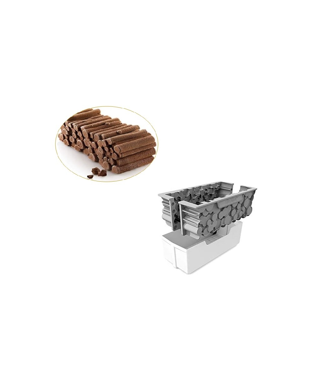 Il Kit Woody 1100 di Silikomart Professional è composto da due elementi in silicone che uniti assieme e posizionati nell'apposito supporto in plastica permettono di realizzare una bûche dal volume di 1100 ml ispirata alla natura. Il kit, dall'originale design che riproduce una catasta di legna, si presta per la realizzazione di semifreddi perfetti per essere decorati con masse a spruzzo che ne esaltano ancor di più la forma.