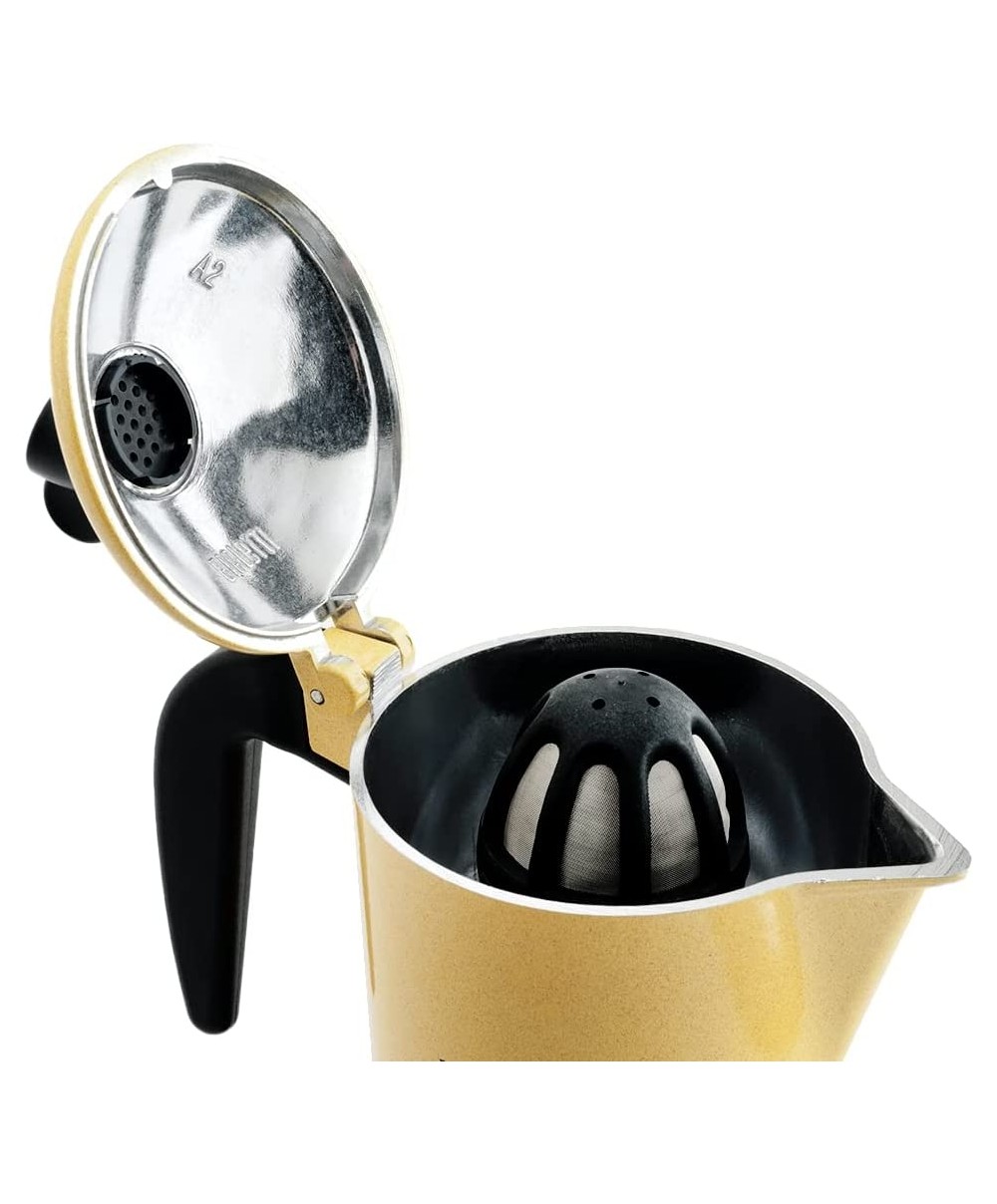 Questa caffettiera è specifica per la preparazione di infusi di orzo in modo con semplice, avvolta in un design esclusivo e dalle forme tonteggianti, eleganti e di tendenza con l'aggiunta di ricercati decori.
