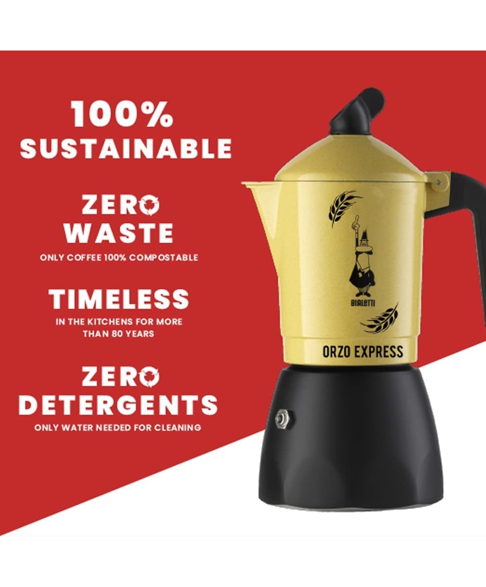 La Orziera Bialetti Express è realizzata con un alluminio speciale idoneo ad adattarsi alle alte temperature, si presenta di un particolare color giallo. Con questa orziera, con lo stesso metodo per prerare il normale caffè, è possibile avere in poco tempo degli infusi di orzo.