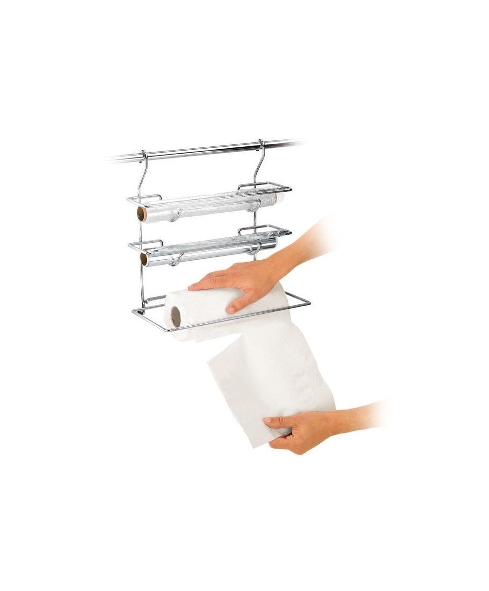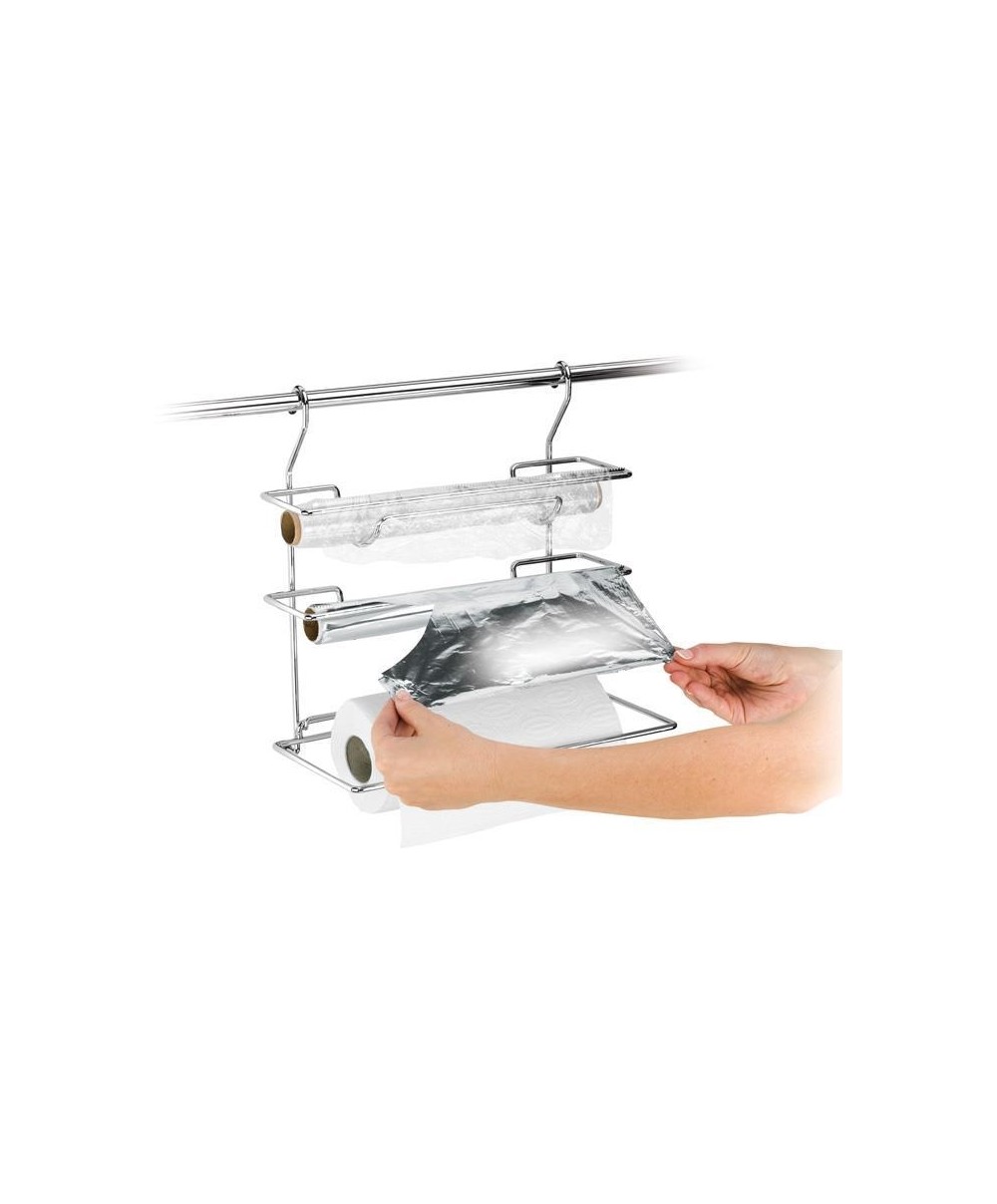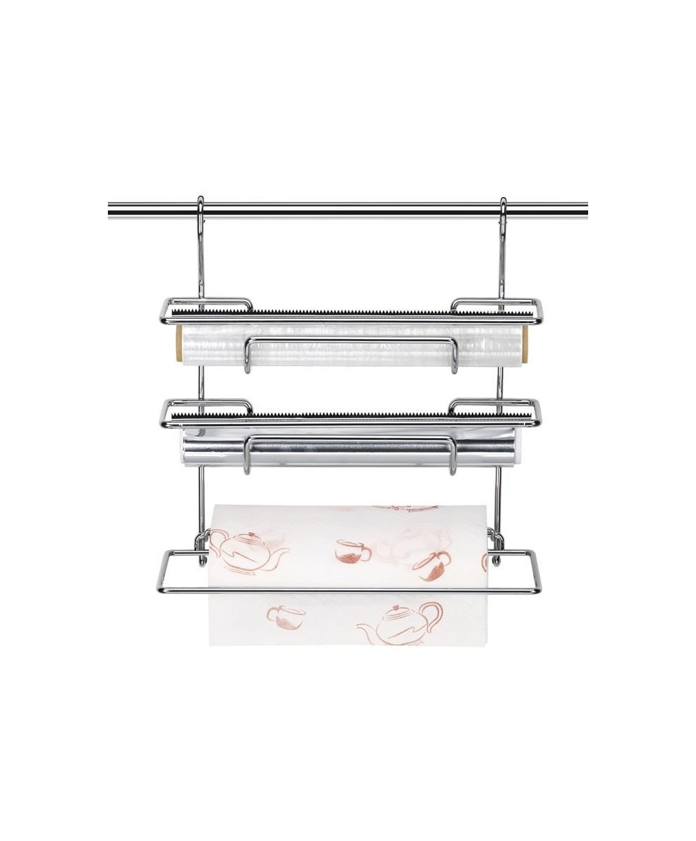 "Il dispenser è in acciaio con finiture cromo ed è perfetto per contenere e tenere in ordine fogli d'alluminio, pellicola trasparente e rotolo di carta da cucina.