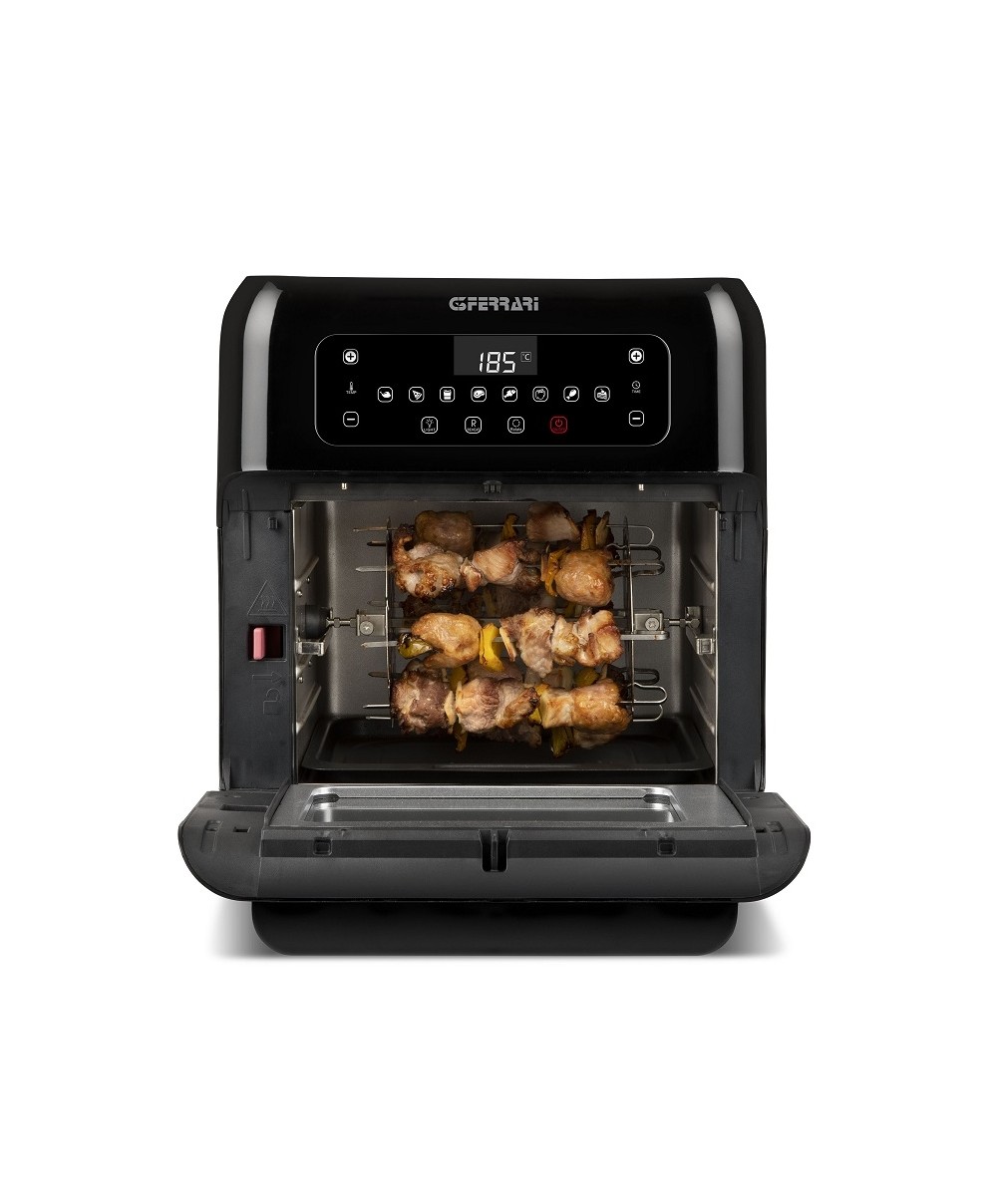 - Accessori: 3 vassoi, cestello, spiedini, girarrosto, maniglia