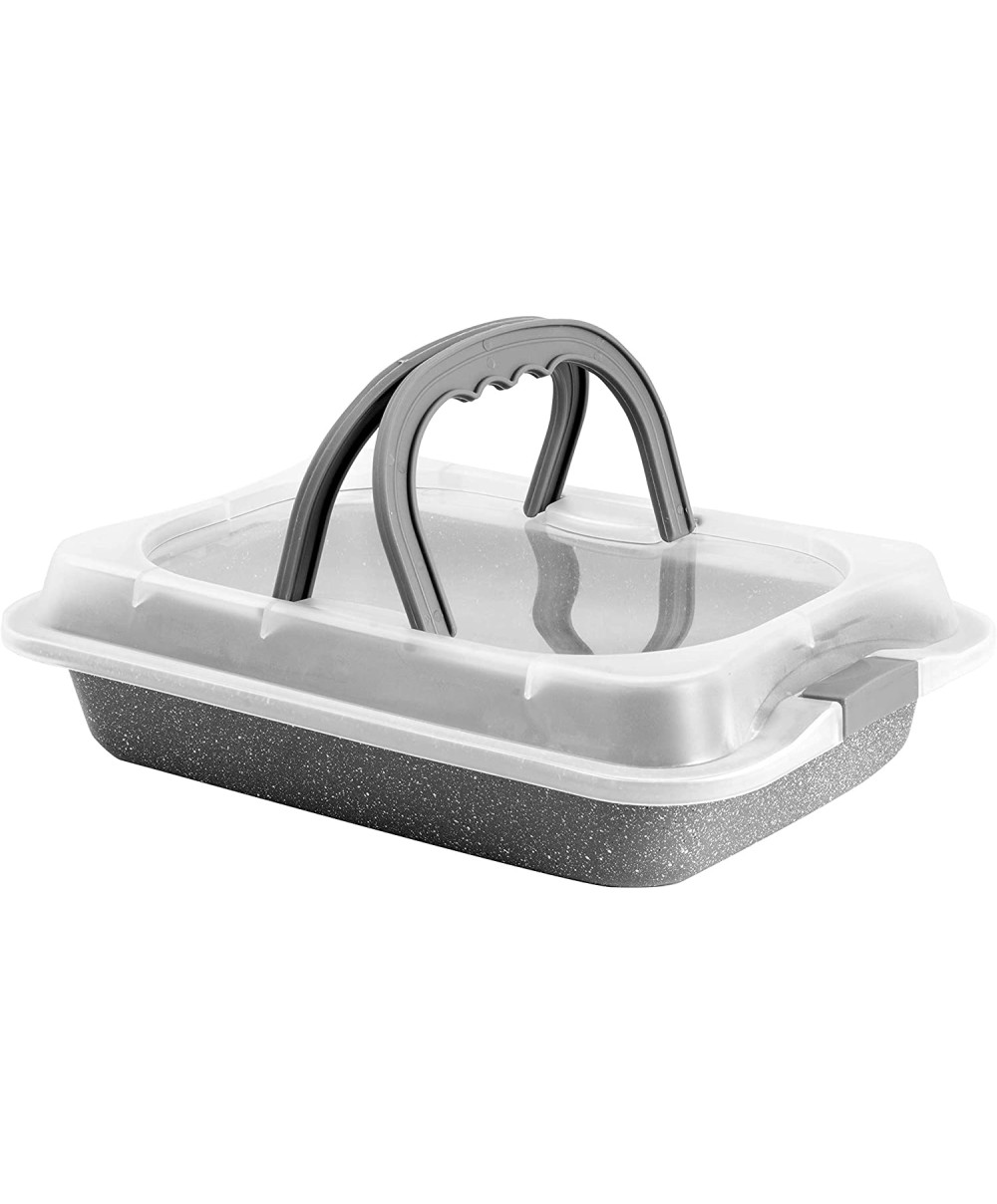 Lasagnera per cucinare le tue ricette preferite e trasportarle comodamente grazie al pratico coperchio trasparente dotato di due maniglie. Il rivestimento interno del prodotto Petravera Plus, rinforzato con particelle minerali, garantisce un'antiaderenza eccellente (PFOA free).