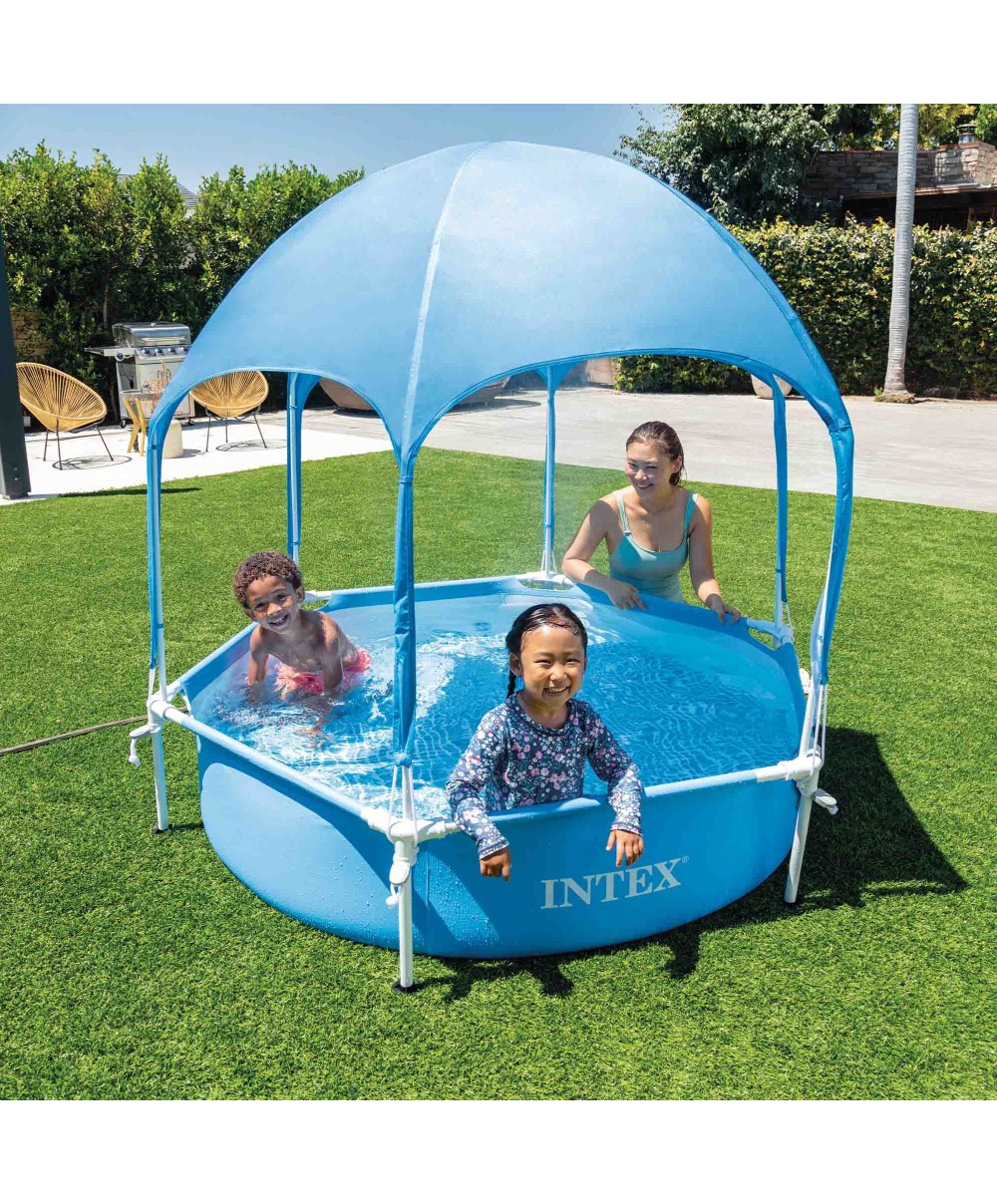 Fai divertire i tuoi piccoli al fresco e protetti dal sole, con la nuova piscina Metal Frame rotonda con tettoia parasole removibile di Intex.