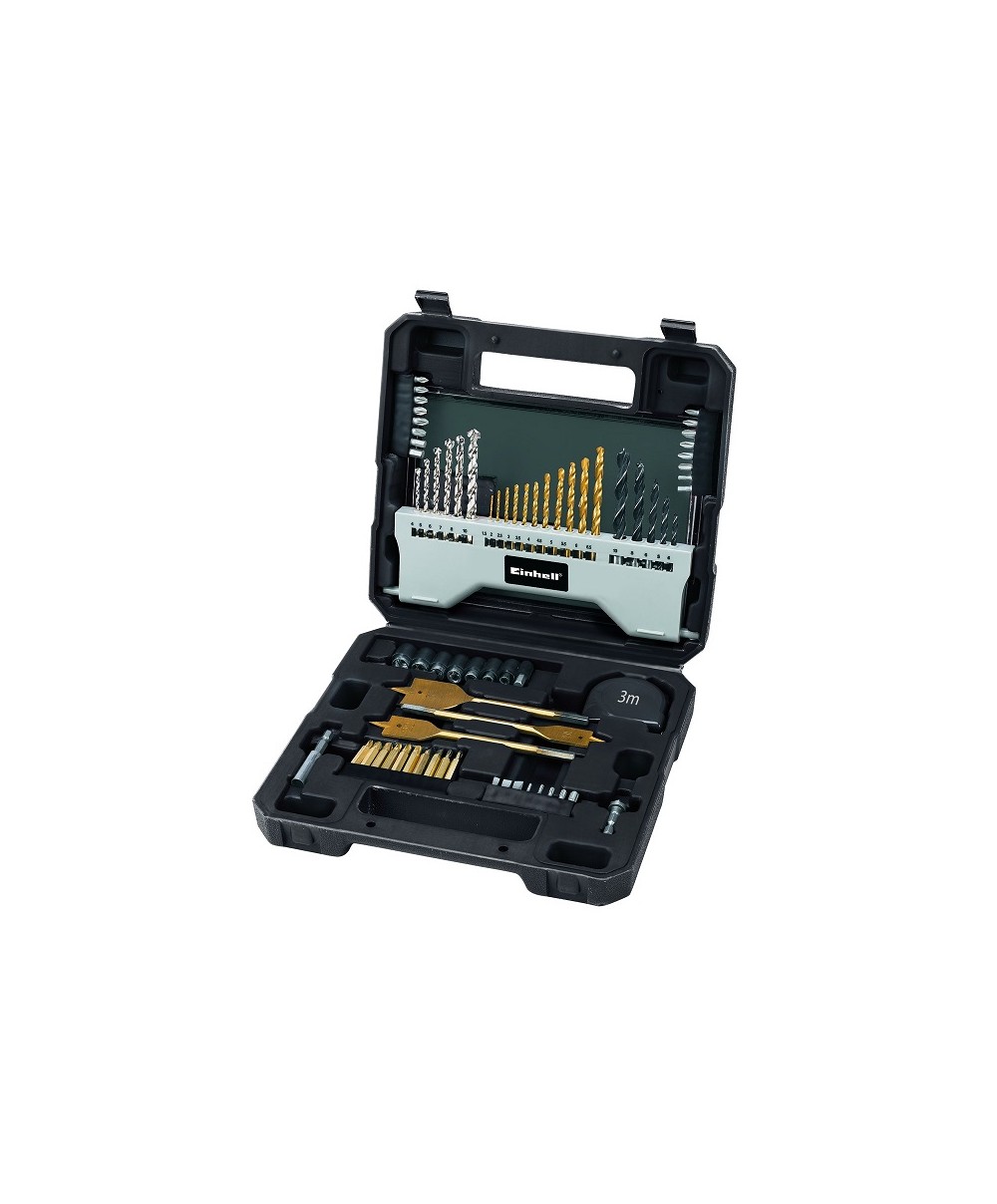 "La pratica valigetta di Einhell 4258085 contiene un set formato da 70 pezzi. Contiene, infatti: 11 Punte HSS per metallo - 6 Punte per muro - 5 Punte per legno - 7 Bussole - 1 Portabussole - 24 Bits - 10 Cacciaviti (bits 50 mm) - 1 Portabits - 1 Svasatore - 1 metro flessibile da 3 m - 3 Mecchie