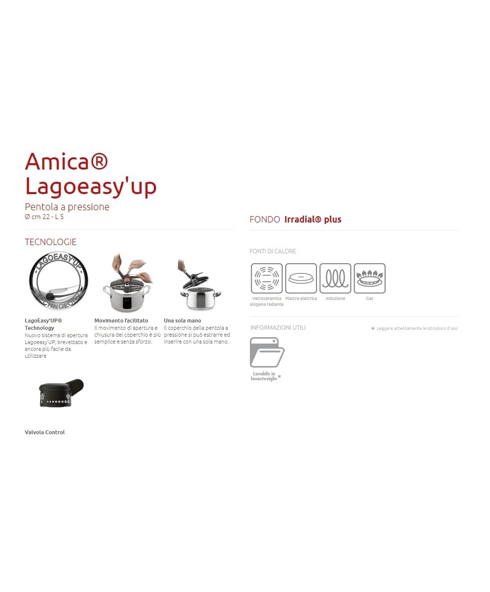 La Pentola a pressione AMICA® LAGOEASY'UP rappresenta oggi un’innovazione senza precedenti grazie all’esclusiva LagoEasy’Up® Technology, il nuovo sistema di apertura brevettato, facile da aprire con una sola mano ed in un solo movimento. La pentola a pressione è uno strumento versatile perché consente la cottura a vapore, ad immersione e a rosolatura; è salutare, perché cucinando in pentola a pressione si preservano fino al 35% di vitamine e di sali minerali in più; è veloce, perché riduce i tempi di cottura fino al 50%. E' inoltre dotata di ben 6 sistemi di sicurezza e del fondo a 3 strati IRRADIAL® PLUS è adatto a tutti i piani di cottura, induzione inclusa, per una perfetta diffusione del calore.