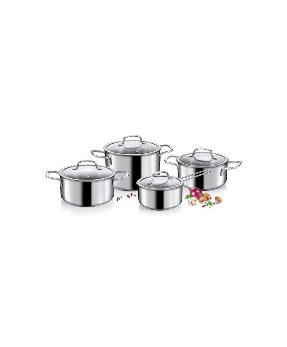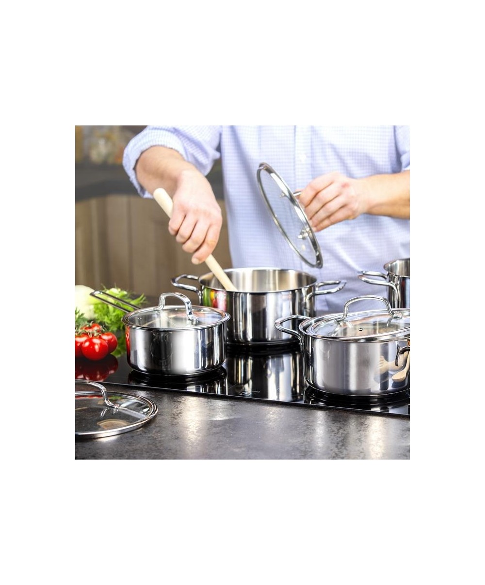 "Batteria di pentole in acciaio inossidabile di alta qualità e adatta a tutti i tipi di cucina: gas, elettrica, vetroceramica e ad induzione. Le pentole sono provviste di uno spesso fondo sandwich; i solidi manici garantiscono una presa facile e sicura.