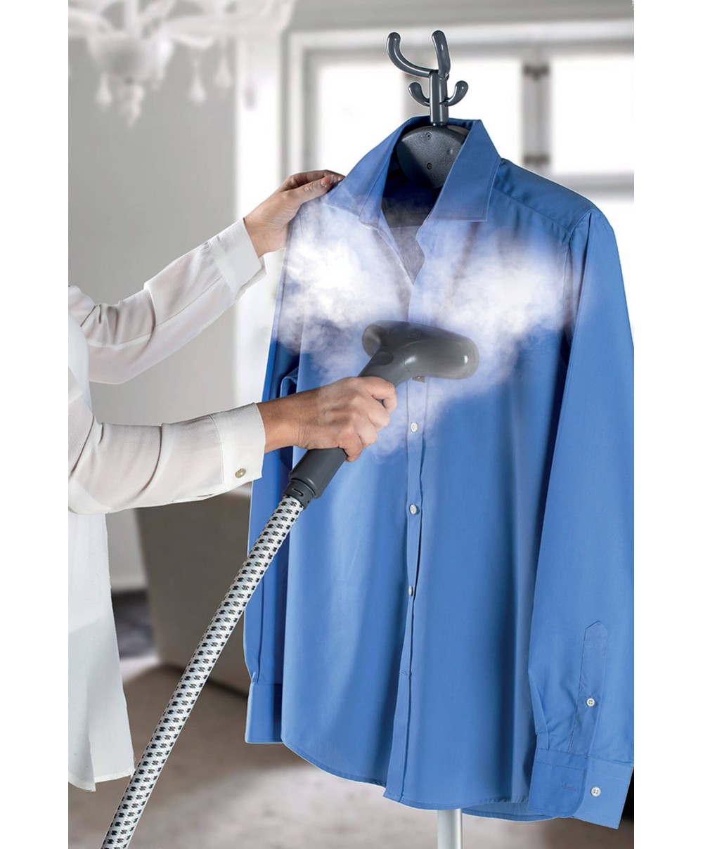 Cambia il tuo modo di stirare con Steam Jet Pro, la stiratrice verticale con asta telescopica in alluminio pensata per stirare in modo facile e veloce qualsiasi indumento o tessuto appeso.