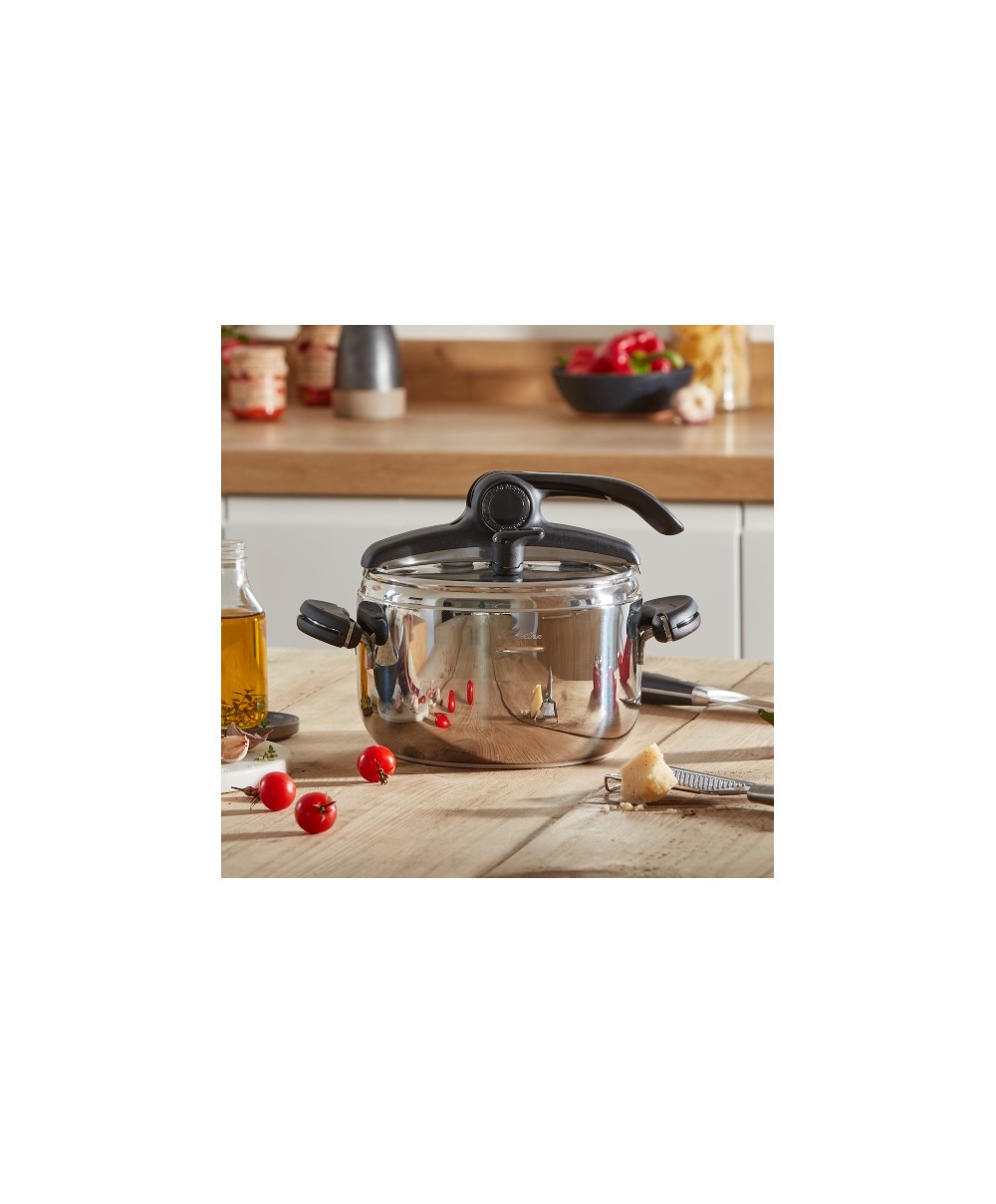 La pentola a pressione è uno strumento versatile perché consente la cottura a vapore, ad immersione e a rosolatura; è salutare, perché cucinando in pentola a pressione si preservano fino al 35% di vitamine e di sali minerali in più; è veloce, perchè riduce i tempi di cottura fino al 50%.