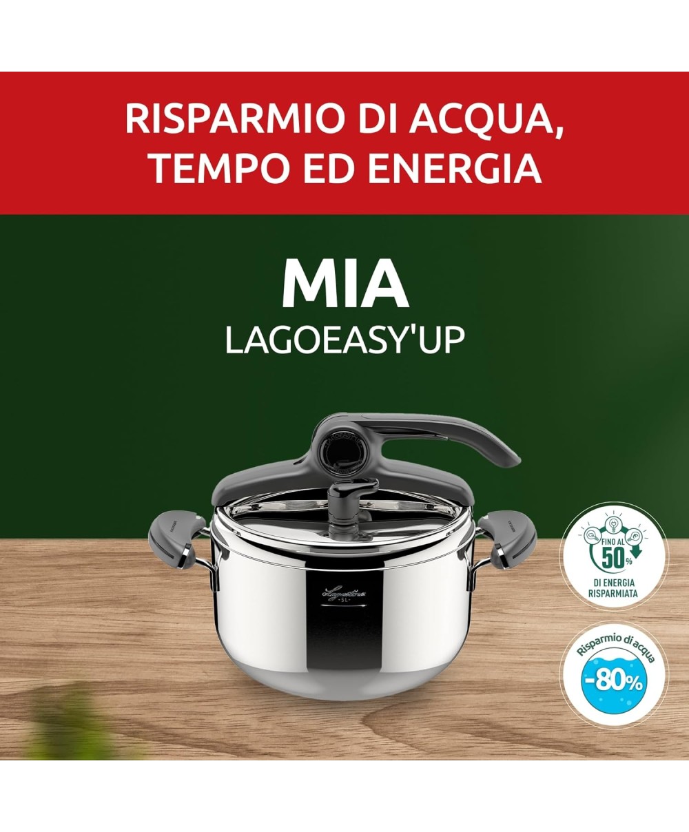 La Pentola a pressione MIA® LAGOEASY'UP rappresenta un’innovazione senza precedenti grazie all’esclusiva LagoEasy’Up® Technology, il nuovo sistema di apertura brevettato, facile da aprire con una sola mano ed in un solo movimento.