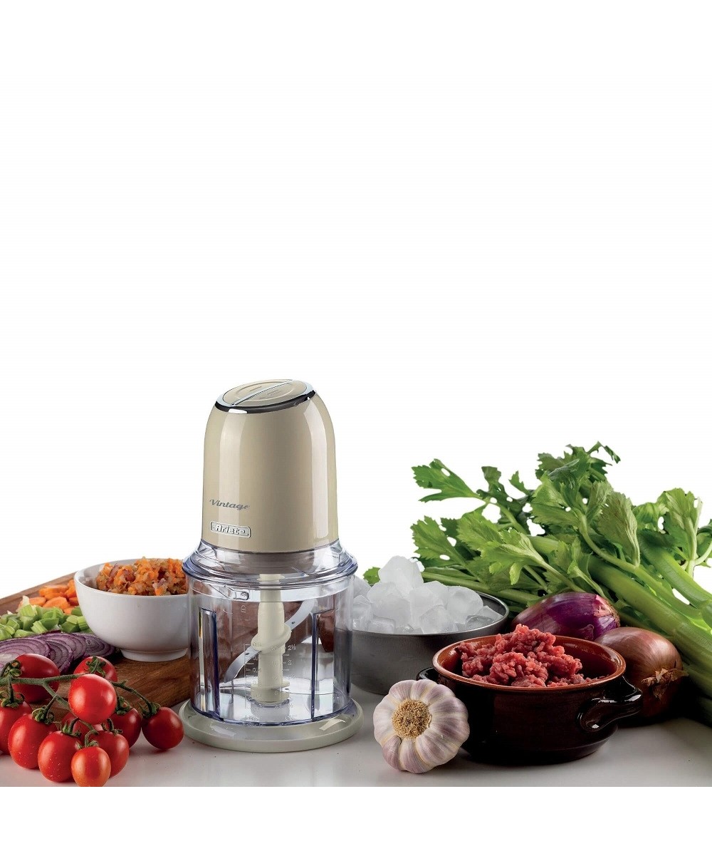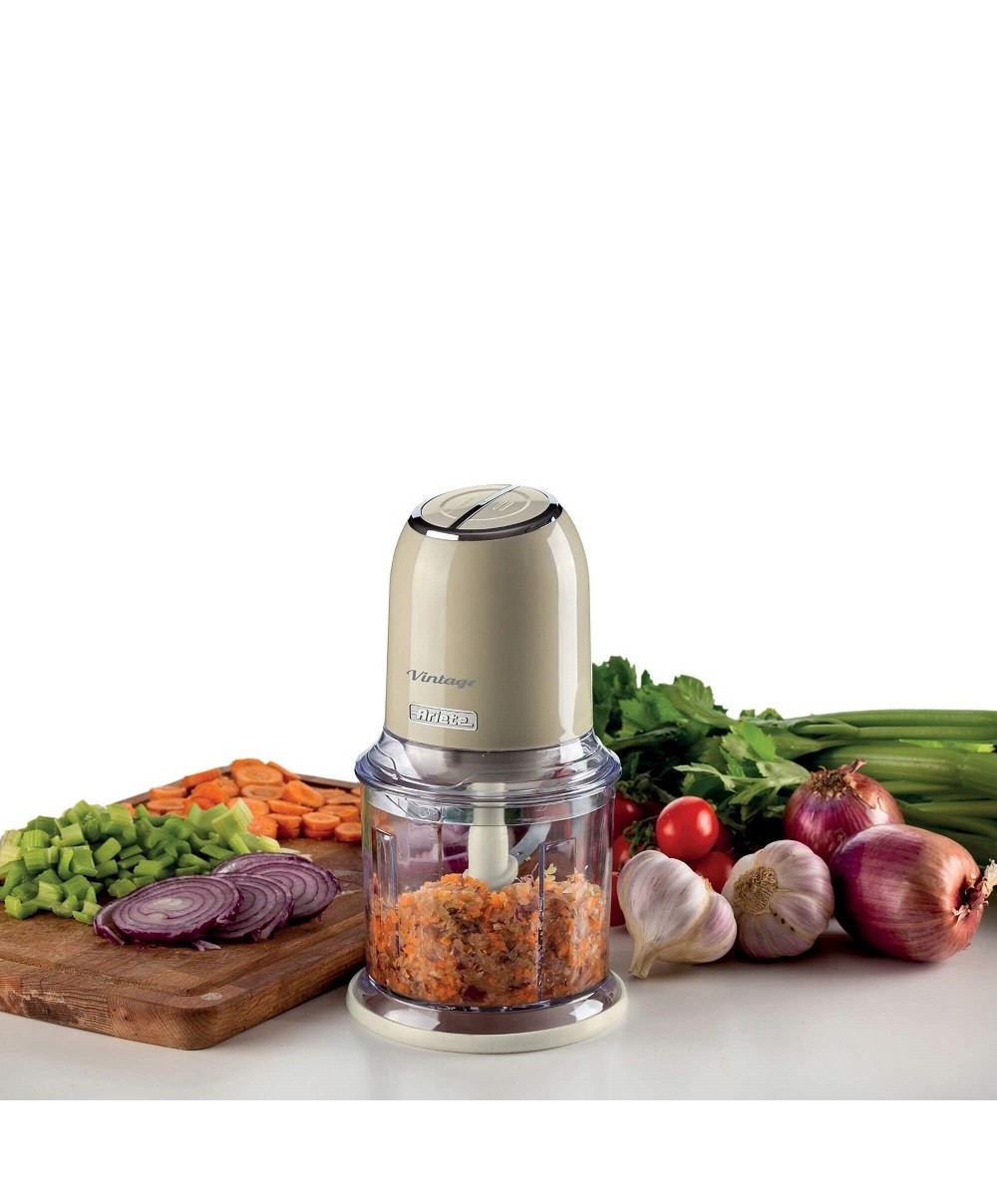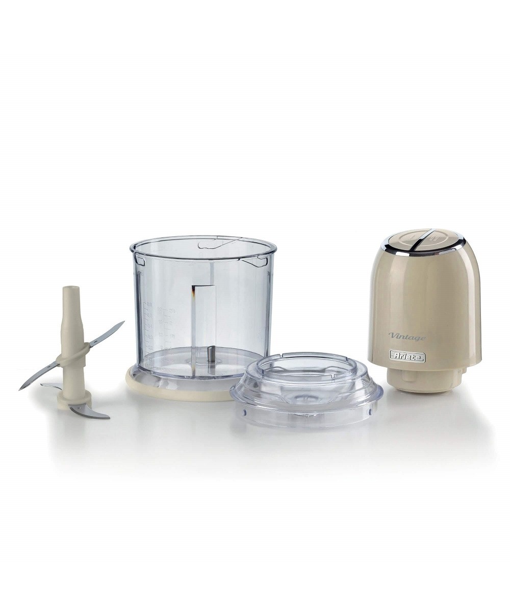 "La Linea Vintage di Ariete si arricchisce di un prodotto indispensabile per le tue ricette in cucina: un tritatutto dalle linee retrò e dai tenui colori pastello, perfetto per portare un tocco di stile e funzionalità nella tua cucina. Grazie alla sua potenza di 400 Watt e alle 4 lame in Acciaio Inox, il Tritatutto Vintage ti consente di tritare qualsiasi ingrediente per le tue ricette: dalle verdure alla carne, formaggio, pane, frutta secca e perfino al ghiaccio. Le 2 velocità, azionabili con i due pulsanti posti sulla sommità del Tritatutto, ti permettono di sminuzzare o tritare finemente gli alimenti, mentre I piedini antiscivolo ti assicurano la massima adesione del prodotto al piano di lavoro.