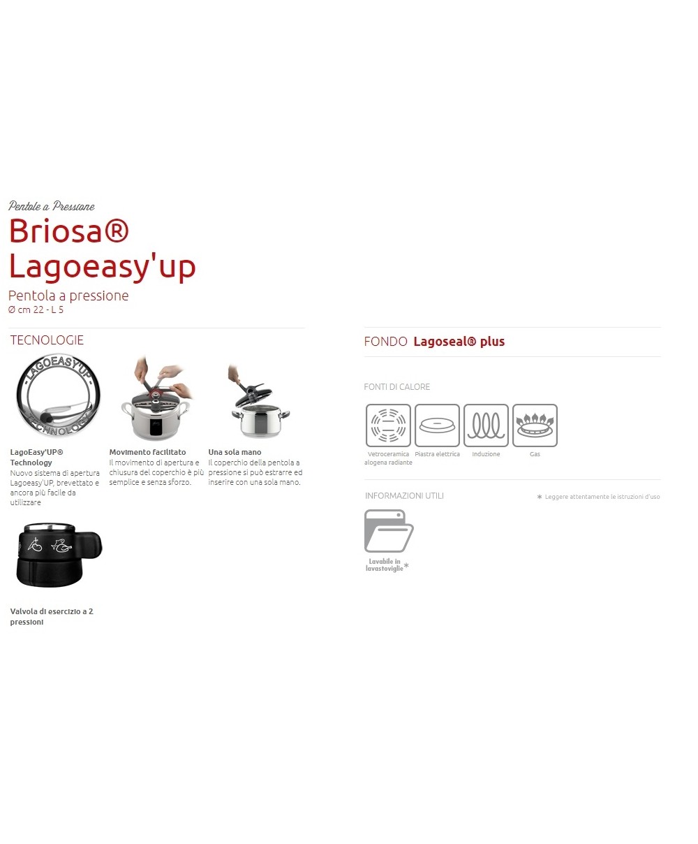 La Pentola a pressione BRIOSA® LAGOEASY'UP rappresenta oggi un’innovazione senza precedenti grazie all’esclusiva LagoEasy’Up® Technology, il nuovo sistema di apertura brevettato, facile da aprire con una sola mano ed in un solo movimento. La pentola a pressione è uno strumento versatile perché consente la cottura a vapore, ad immersione e a rosolatura; è salutare, perché cucinando in pentola a pressione si preservano fino al 35% di vitamine e di sali minerali in più; è veloce, perchè riduce i tempi di cottura fino al 50%. E' inoltre dotata di ben 6 sistemi di sicurezza e della valvola Vitamin a due pressioni: posizione 1 per alimenti delicati come le verdure, posizione 2 per carne e pesce. Il fondo a 3 strati LAGOSEAL® PLUS è adatto a tutti i piani di cottura, induzione inclusa, per una perfetta diffusione del calore.
