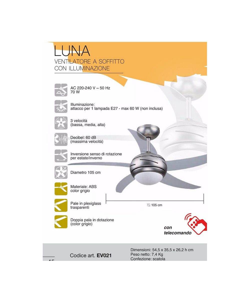Luna è il ventilatore da soffitto con Illuminazione di CFG che può essere utilizzato sia in Estate che in Inverno. È dotato infatti, della funzione di inversione del senso di rotazione delle pale. Il Telecomando, rende il suo utilizzo ancora più semplice. EV021 è dotato di doppia pale: in plexiglass o in MDF grigio.