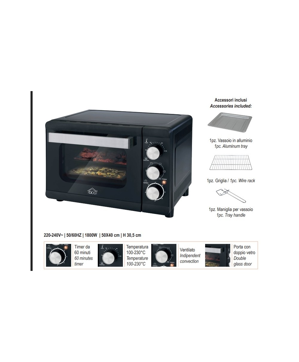 MBN35 è il forno elettrico ventilato da 35 litri ideato da DCG con funzione statica e ventilata perfetto per la preparazione di piatti appetitosi e ricchi di sapore fatti. Con i suoi 1800 Watt di potenza, una capacità di 35 litri e 5 modalità di cottura ti permetterà di preparare arrosti di carne, pesce, verdure, pasta al forno, pizze, torte, biscotti con tutto il gusto e la bontà delle cose genuine fatte in casa.