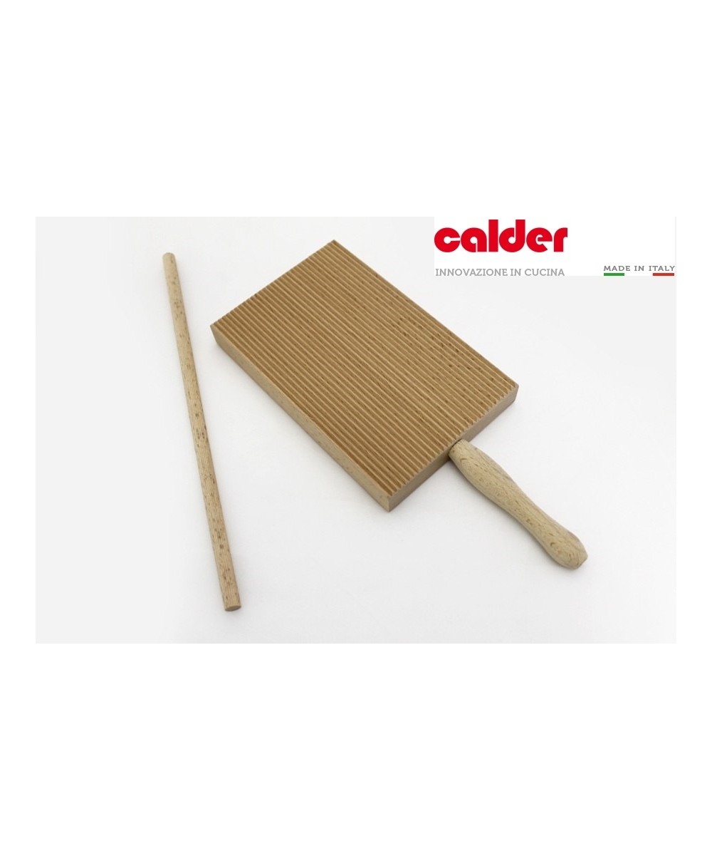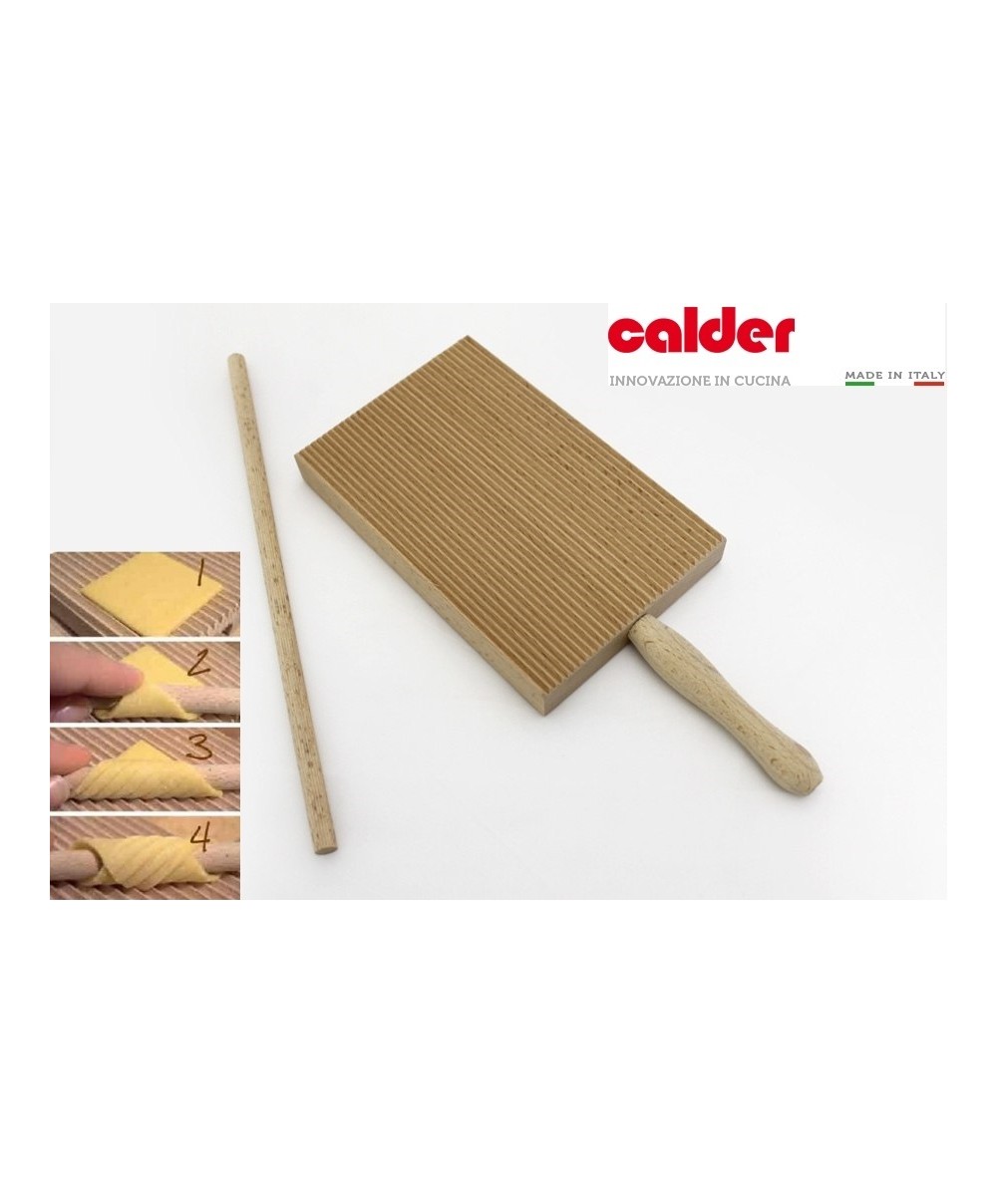 5051 è l'attrezzo per garganelli di Calder realizzato in legno di faggio. È dotato di bacchetta per poter realizzare i garganelli e la tavoletta è ideale anche per rigare gli gnocchi. Dimensione: 23,5 x 9 x 2 cm ca
